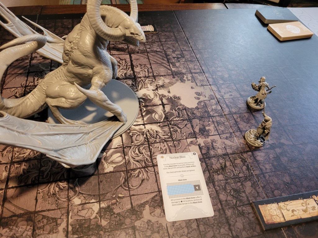 Weed was up next. Like clockwork, he did crit the monster, presenting him with a chance to spend 2 survival to gain permanent +1EVA. An easy choice to be sure and naturally he took the opportunity. (Compared to other crit effects of this type.. this one is exceptionally cheap, isn’t it?)
