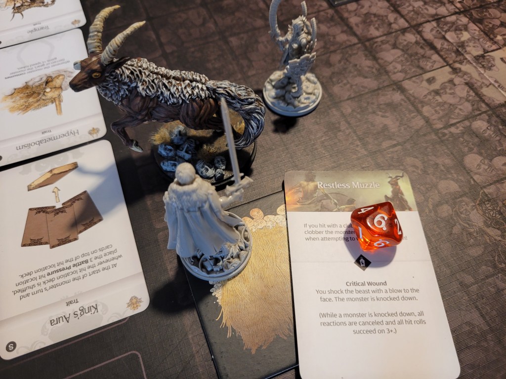 The Mad Steed is one of the four legendary monsters in the core rulebook. It is Level4, has 9MOV and 18(22)TGH. It also has +2SPD and +5DMG(!) in addition to +1ACC and +1LCK-tokens. It sports a curated deck of AI cards centered around running you down to get a nibble in, and the Life trait set to 20. Aside from the typical Lvl3 lope traits it also has the Berserker trait from the Butcher – letting it draw an additional AI card each turn and .. oh.. .. .. .. .. King’s Aura… the Kingsman trait which adds 3 Battle Pressure to the top of the HL deck each turn. I hadn’t picked up on that earlier.