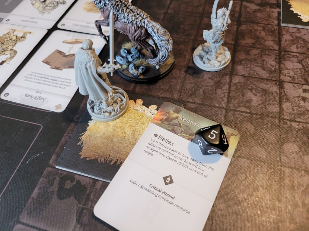 As our turn started Calystea got up and dashed towards the Antelope to get rid of the Battle Pressure. With the Horripilation dice she managed to take off all 3. Before the next person could activate, she surged an attack for 2 more hits as well.