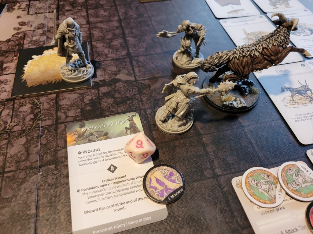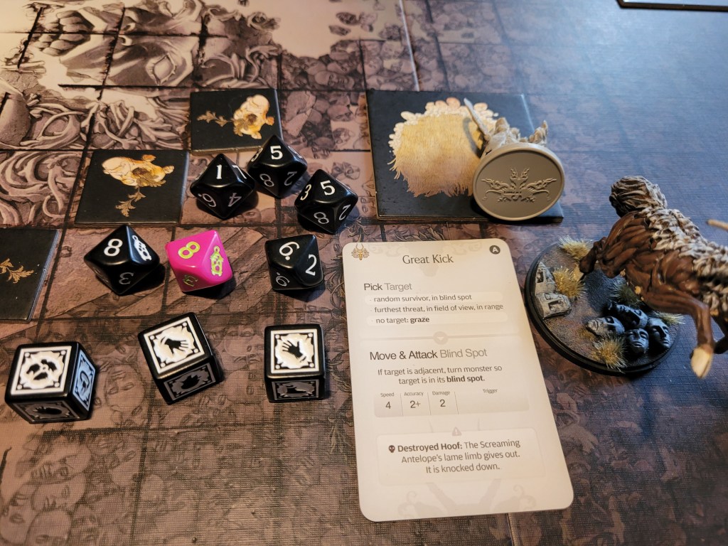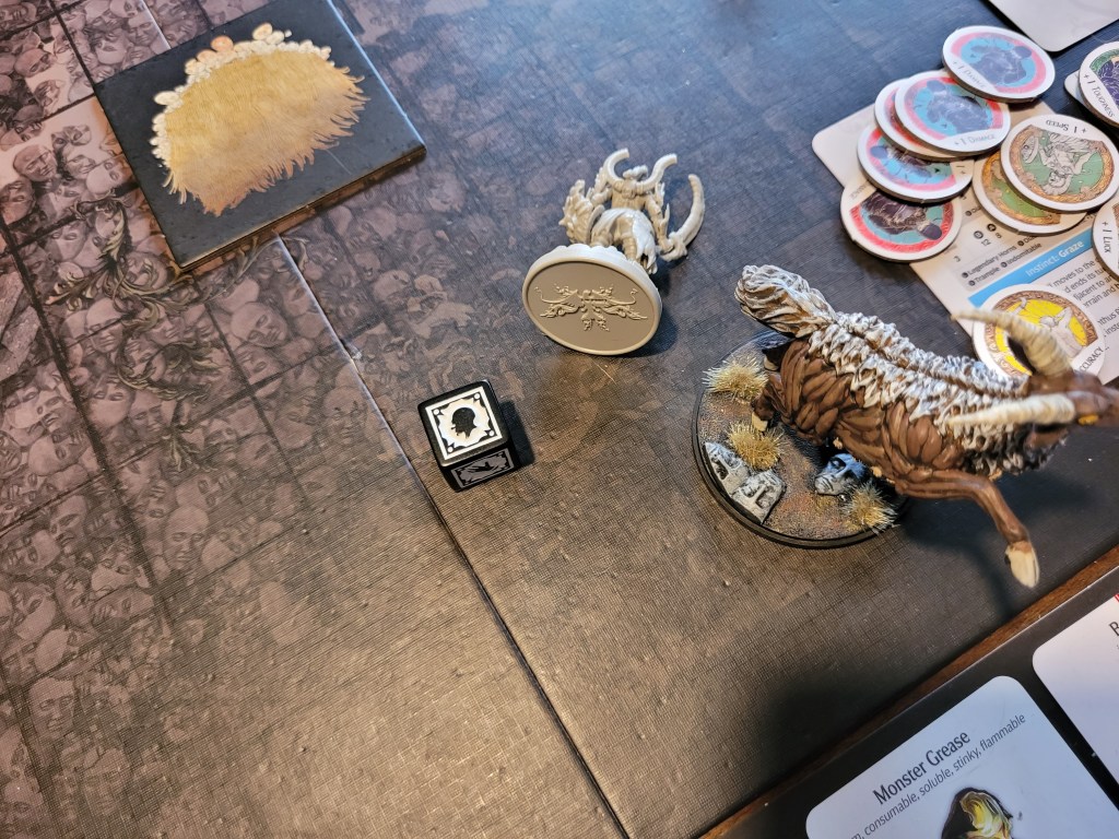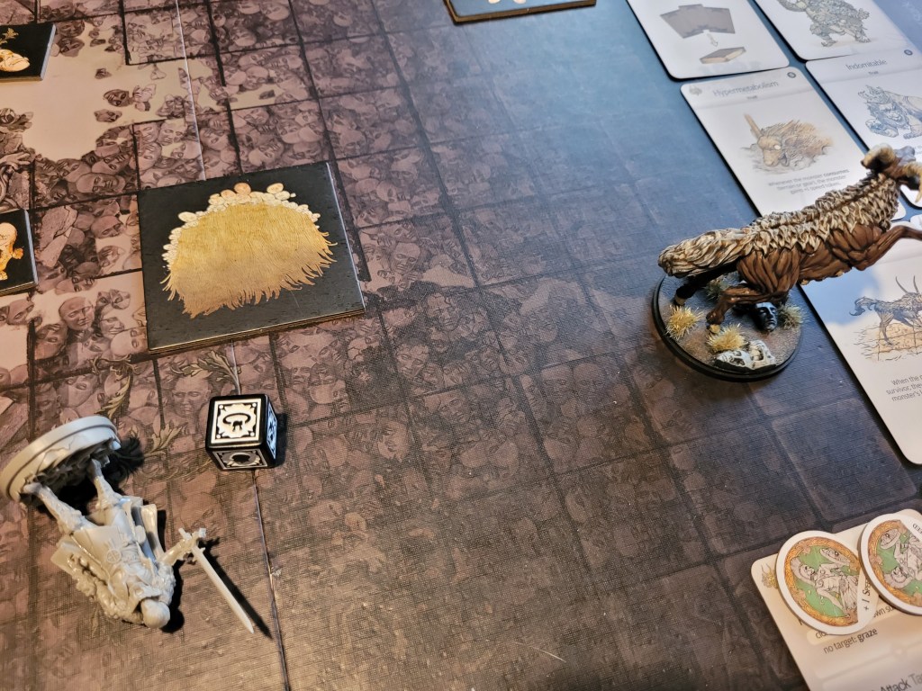 I considered for a moment if Weed really should go in as well, but this was our pivotal moment in the fight. Carrying all our hopes his attack struck true and he did fell the mighty beast as the crit removed the tokens we were able to stack back onto the monster, before the group of survivors could all get knocked over and die to lope shenanigans!