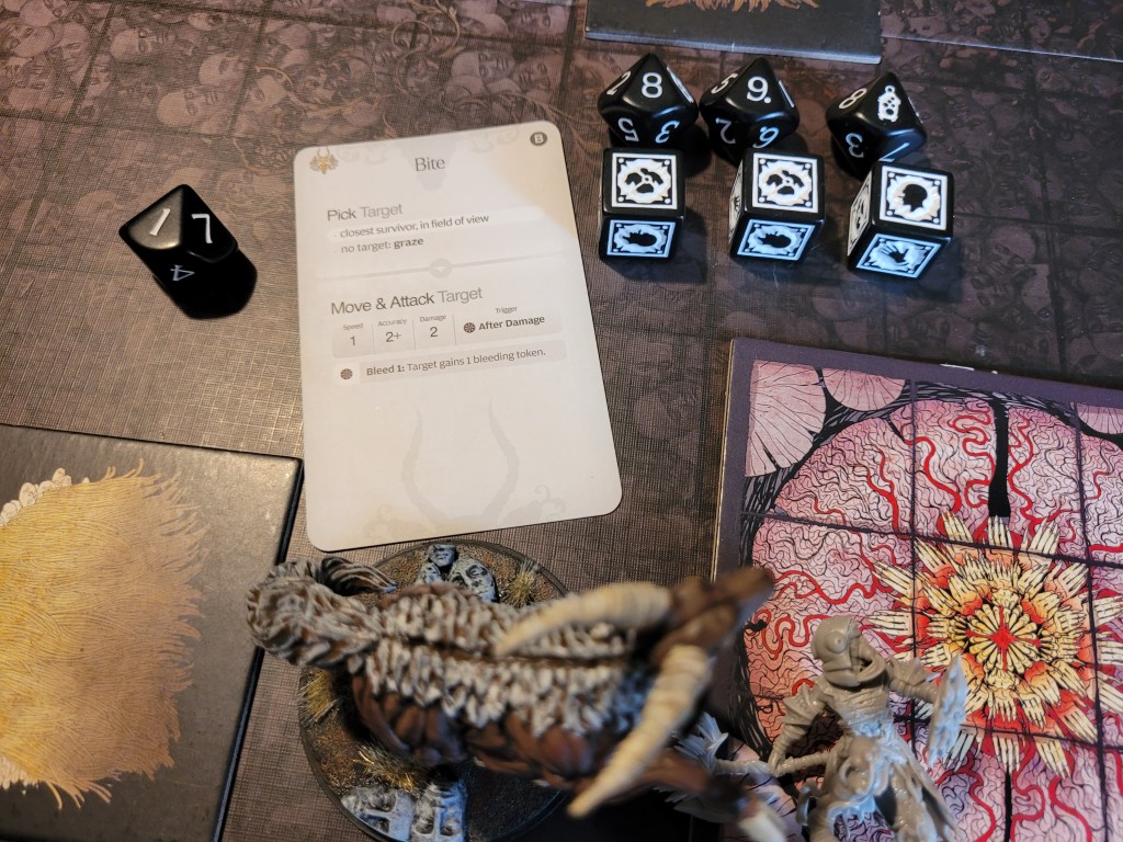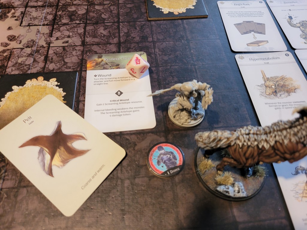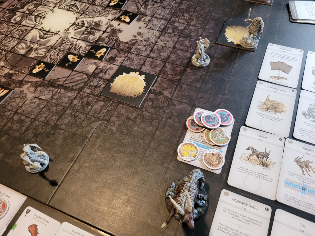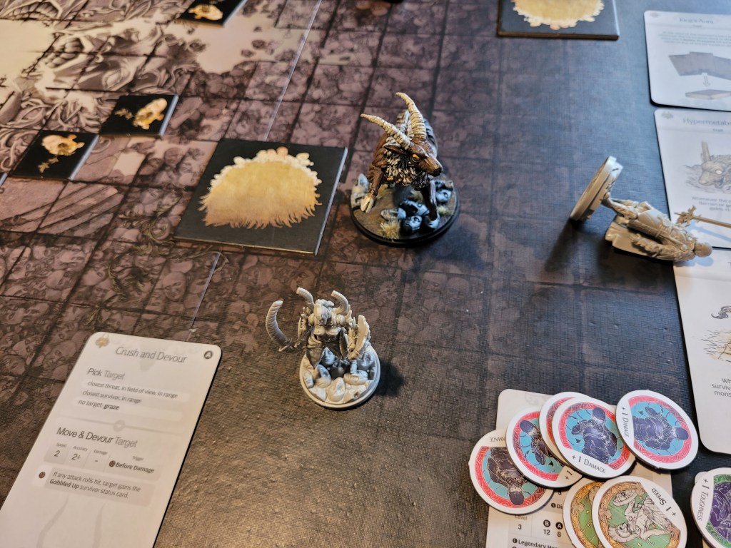 I considered for a moment if Weed really should go in as well, but this was our pivotal moment in the fight. Carrying all our hopes his attack struck true and he did fell the mighty beast as the crit removed the tokens we were able to stack back onto the monster, before the group of survivors could all get knocked over and die to lope shenanigans!