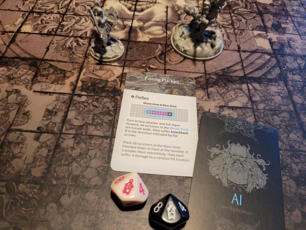 This had brought Ghurt close enough to the fight for him to dash and charge the Gold Smoke Knight. But this was the point when I noticed that I had forgotten to Frenzy him – he had Rageholic (D). So much for that plan if he couldn’t spend survival – of course I also forgot about Red Fist (SFA) adding the ability to spend the +1STR-token.