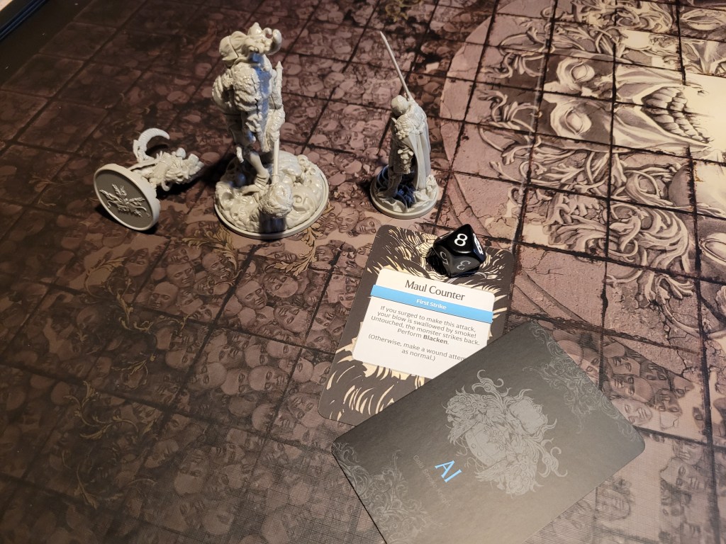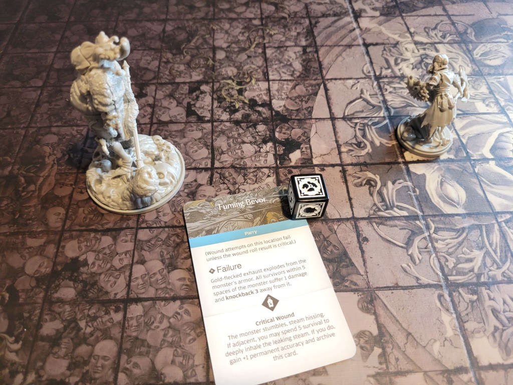 Calys moved towards the monster and attempted an attack. (Edit: this right here was probably one of the bigger misplays during this fight, perhaps likely of the campaign as a whole: Ghurt could have used a +1STR-token in place of survival to dash closer and subsequently charge at the monster had he activated first. Instead:) Calys hit the monster twice and got 2 bad reactions to chose from, she failed the wound at first, but as an axe specialist she was able to turn it around – first blood for the survivors.