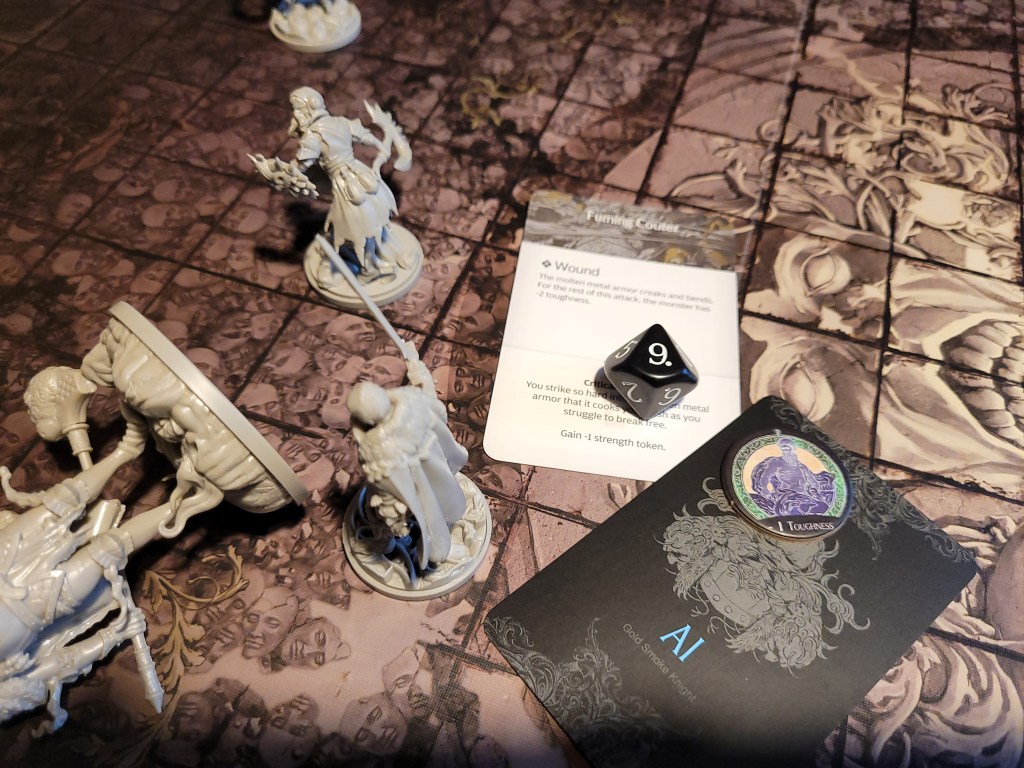 Against better judgment he surged and managed to squeeze out 1 more hit, luckily that time Wrath did its thing and it crit! Ruining the monster’s armor lifted the survivos’ spirits.. and it removed the -1TGH-token to deal some additional damage on top.