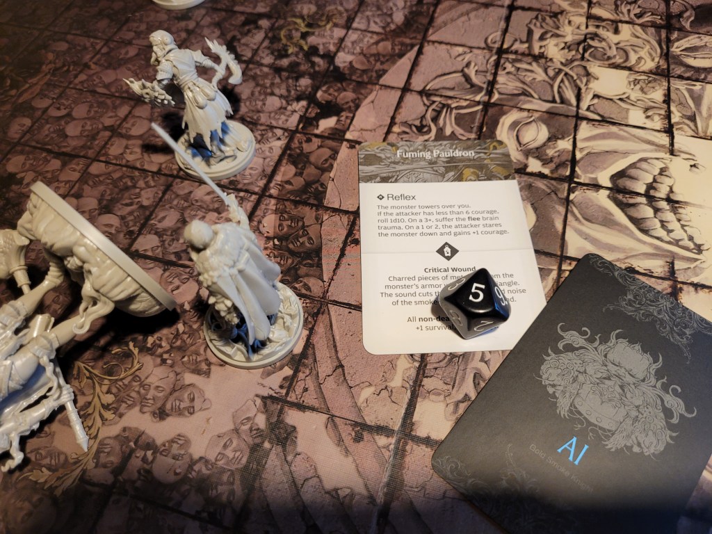 Calys on the other hand was an easy target, to be hit on 3+, the survivors were not doomed so she could still block and dodge and with all tools available to her, she only took 1 hit to her arms at the end.