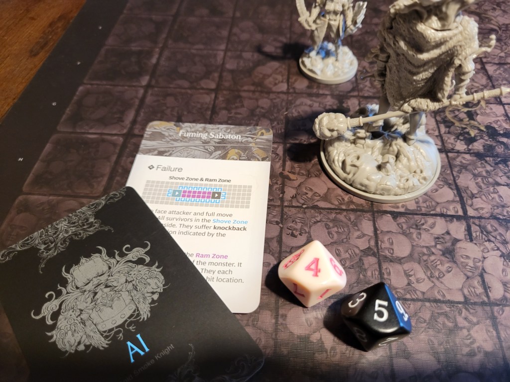 16 cards remaining, the second card to be played.. was the other legendary! Diaphoresis. Calys had the death dice at this point, so she was the chosen target, lying right at the feet of the Gold Smoke Knight. She was swallowed by the gold-flecked (the cards says its milky red) gas cloud streaming from the monster’s clanging armor, but not before being encouraged and running away to not get hit by Blacken too hard afterwards as well. She did not roll any hit location twice, but she lost all armor at the head and waist.