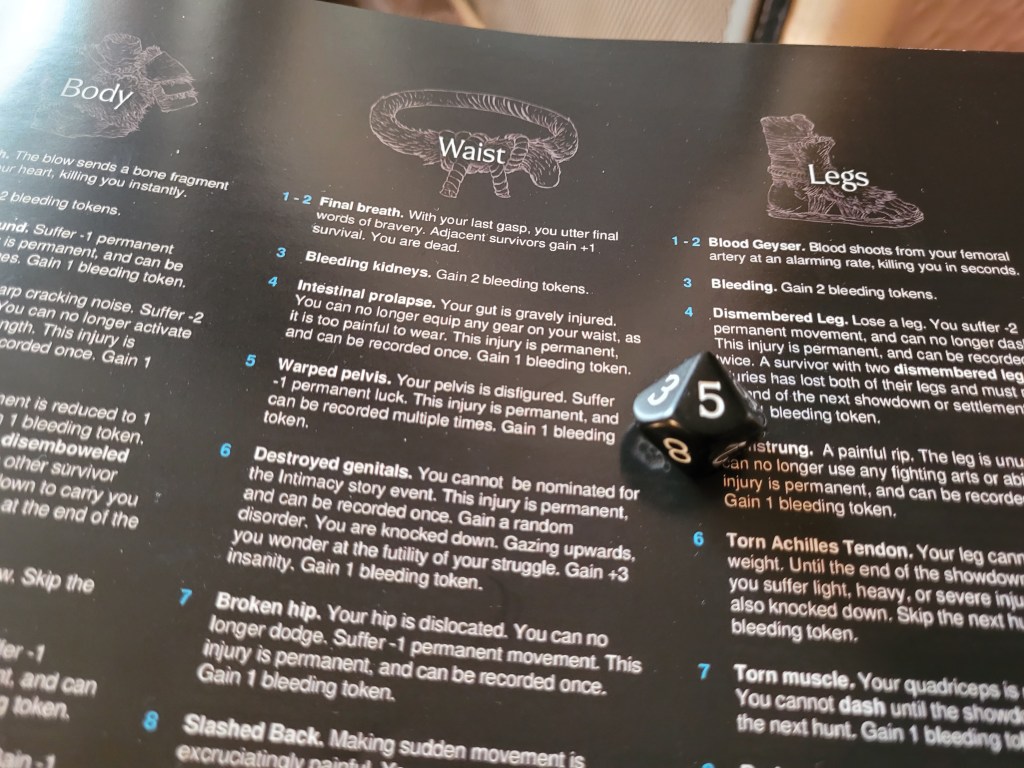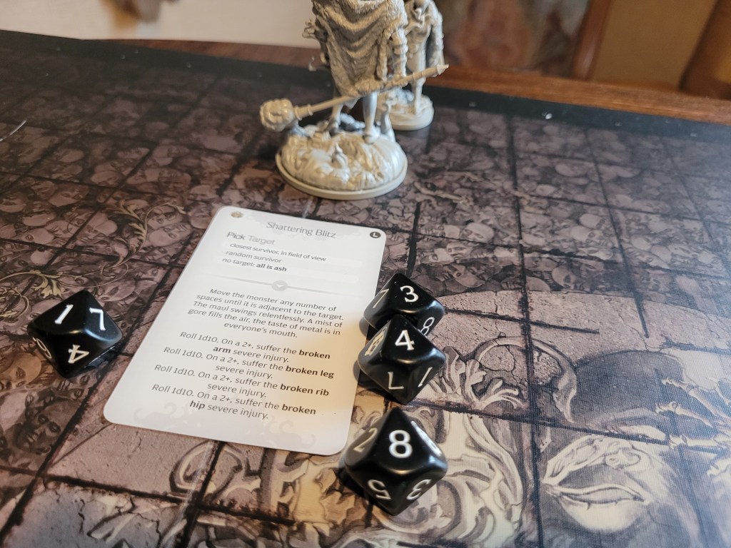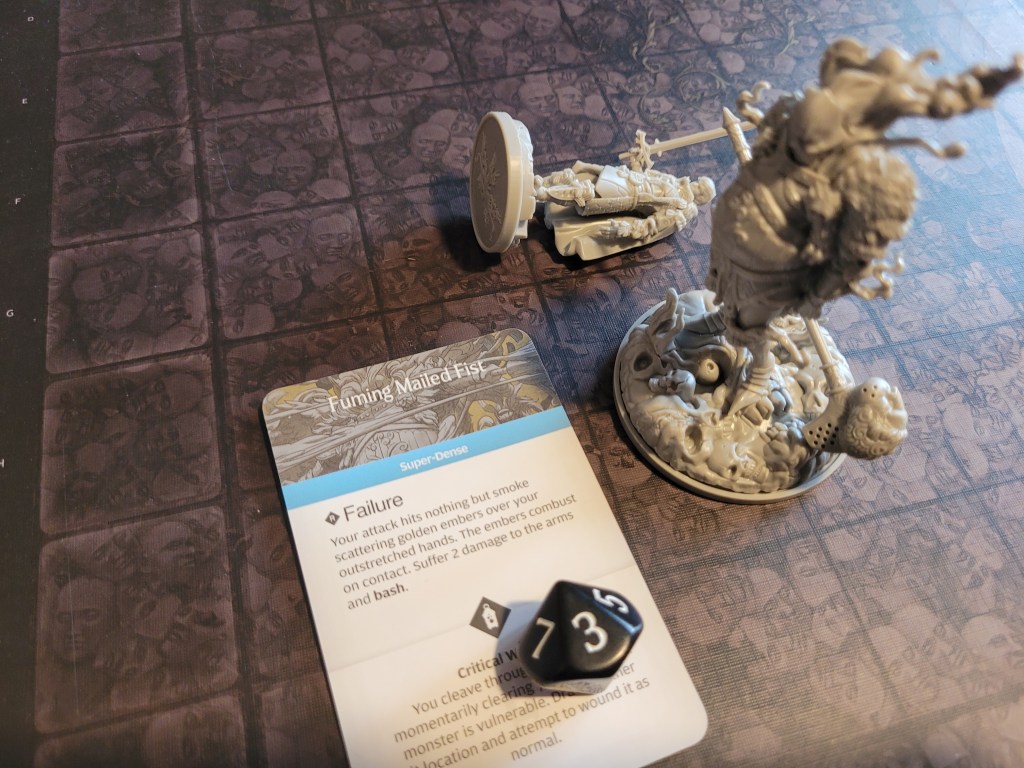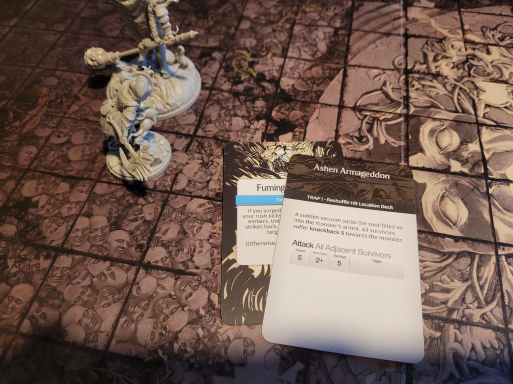 9 cards remaining, Savage Grab. Calys was to be the target – again. The monster turned around but did not quite make it all the way over to her. Frustrated it started pummeling her. She was able to dodge 2 more hits, which was only possible thanks to Red Fist (SFA) and her final survival, before she took 1 more hit to the armor of her feet. That left her with 2 more hits to still soak up somehow. A 6 and 7 were rolled for severes, 2 more bleeding tokens .. she bled out after rerolling a 1 as well with her token. The first of our survivors had fallen – but the monster was not ready to stop just yet.