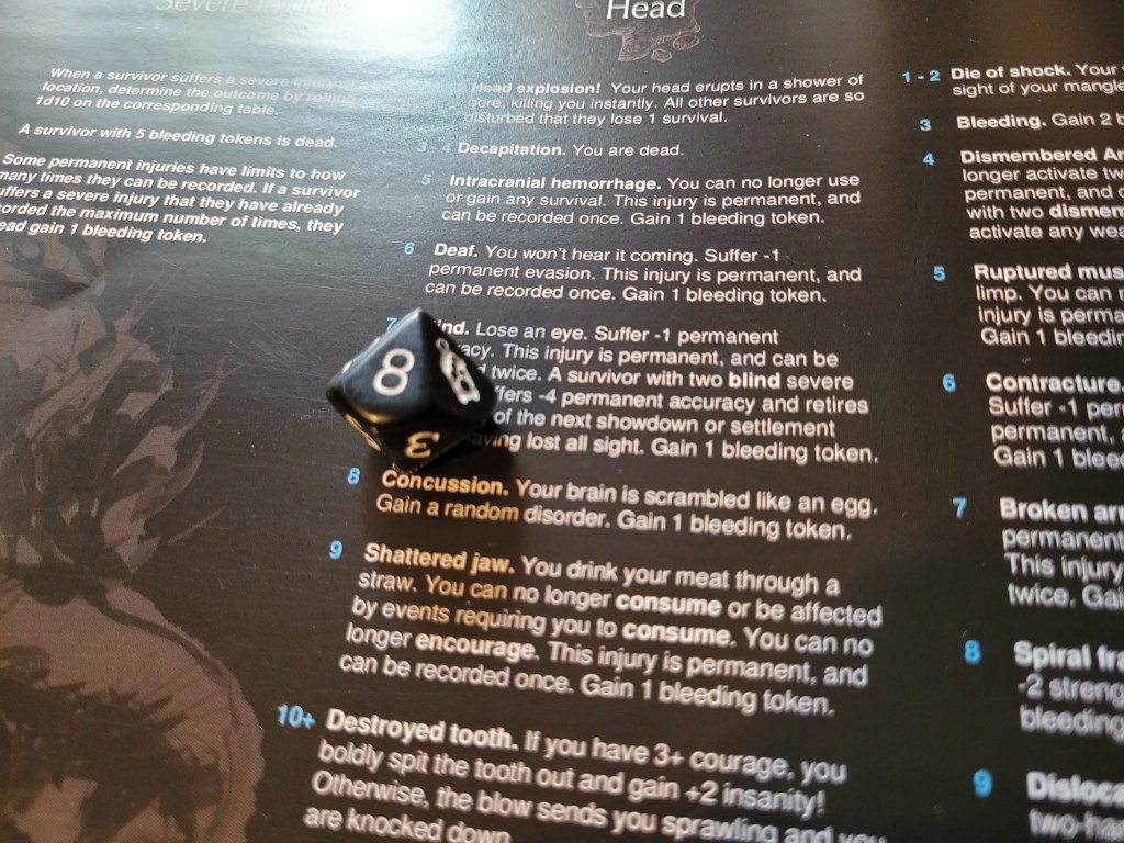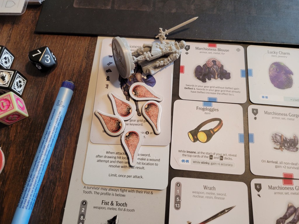 4 severes were inflicted and Ghurt took 4 Bleeding tokens in addition to -2MOV and -1SPD/STR/ACC. He could also no longer dodge. (Edit: I will notice this a little later – he was also Frenzied at this point, due to Rageholic D – thus he couldn’t spend any more survival for the rest of the fight either).