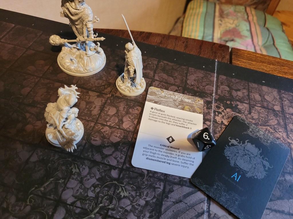 On 8+ the Knight still managed to hit him 3 times.., sure. And even the 1 armor he gained from the effect of his Mage’s Hood did not save us as the severe waist injury he had to take killed him with the 1 extra bleed. Just like that. the second survivor had fallen.