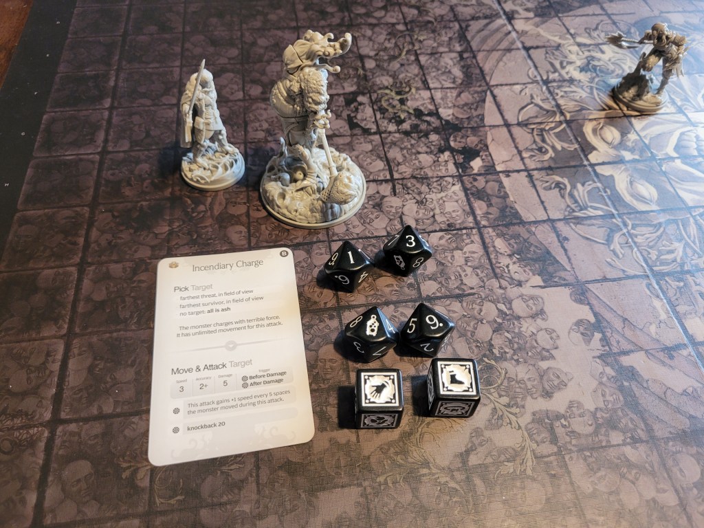 6 cards remaining, Incendiary Charge yet again. On 5+ the monster missed all its attacks against Weed! Blacken did hit him significantly though and he had to spend his last STR-token to not take another severe leg injury but aside from that he was “fine” for the moment. *laughs nervously*