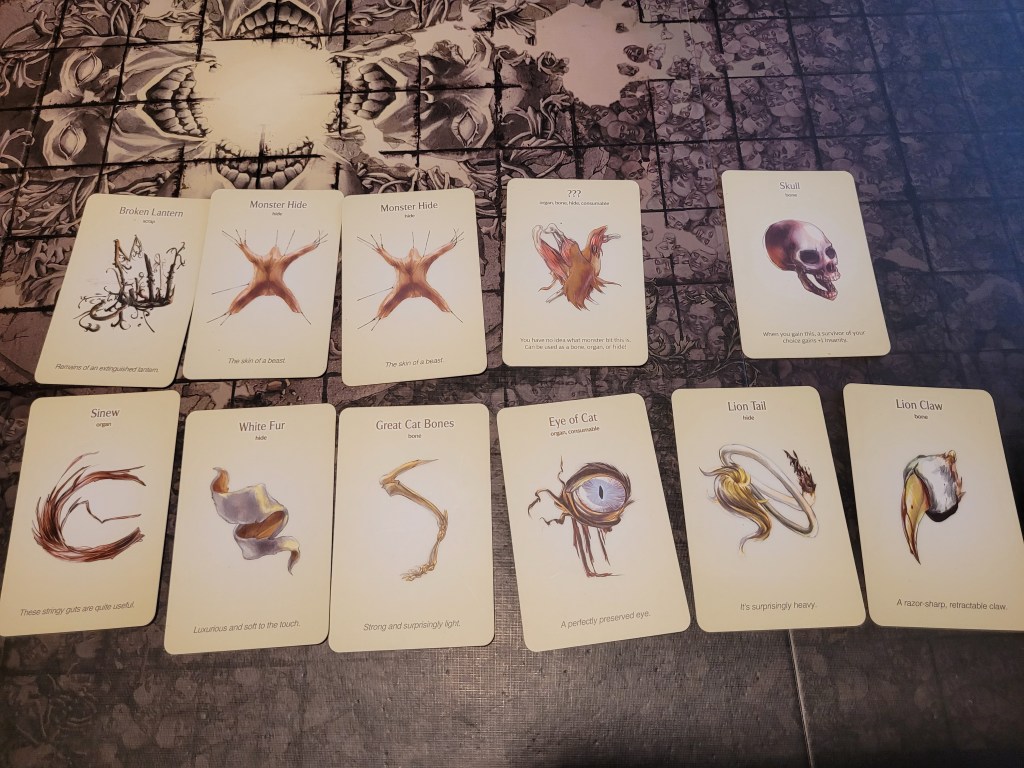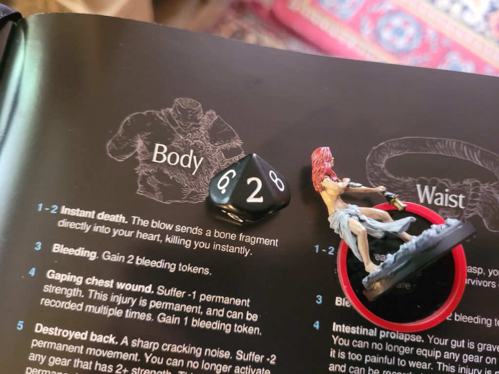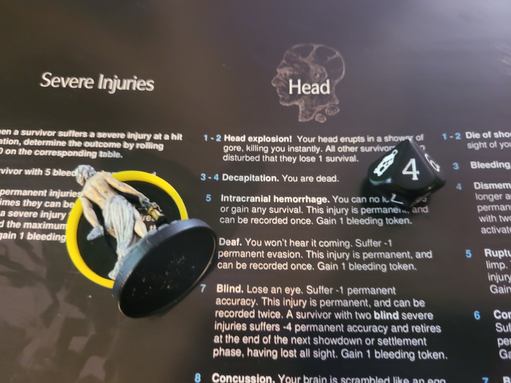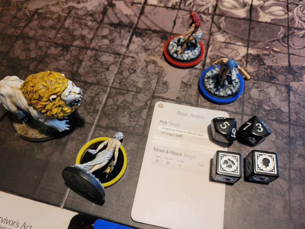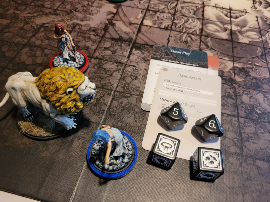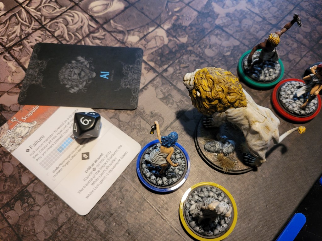 0 cards remaining. The basic action targeted closest in field of view.. and that’s Bjorn. Knocking Lionar out of the way, the Lion attacked the already prone survivor and hit his head again for a third time. And that’s a severe injury!