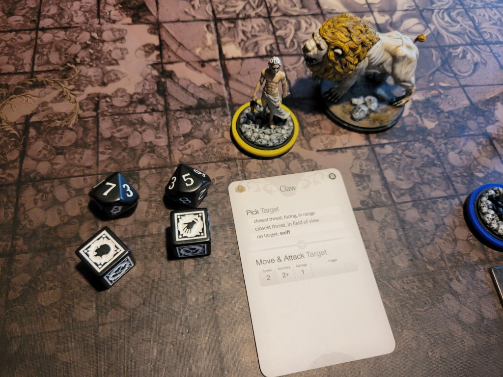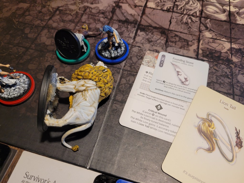 Thankfully Alissa could turn the trend around. She hit and wounded, preventing the White Lion from running away, before Bjorn came in with the big hit of the round – critically injuring the Beast’s Paw, giving it -1MOV, gaining a Lion Claw and turning off grab for the remainder of the fight!