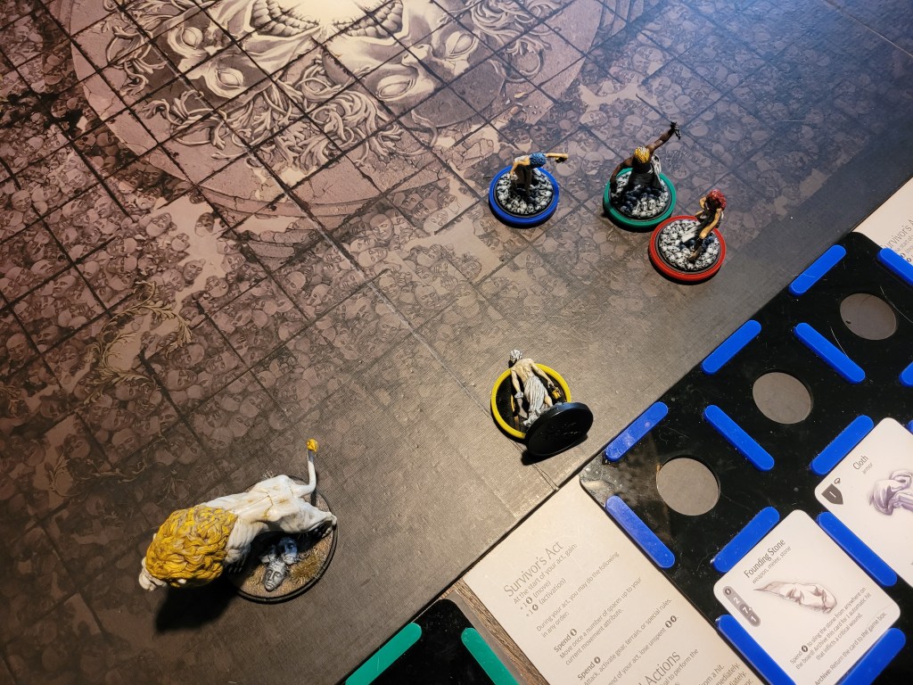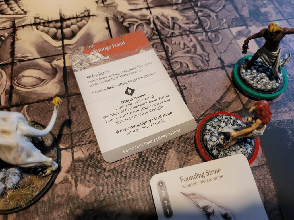 As our turn rolled around, Calys threw her Founding Stone to auto-crit the Strange Hand and gain +1STR at the cost of her 1 survival – as was preordained as well.
