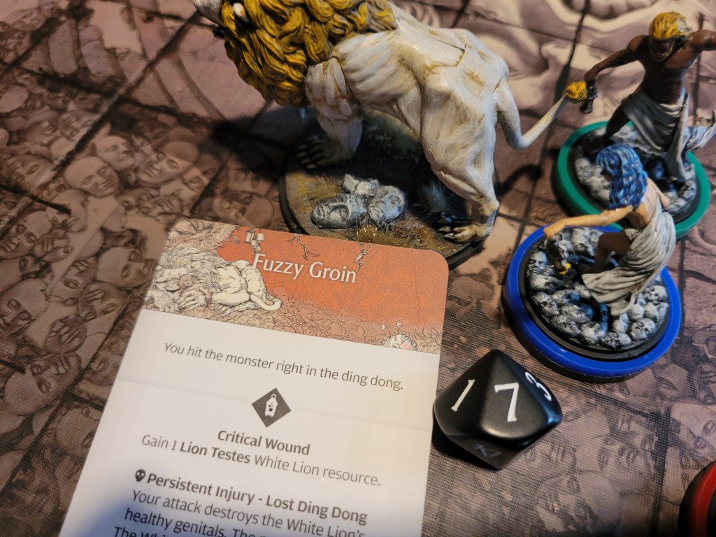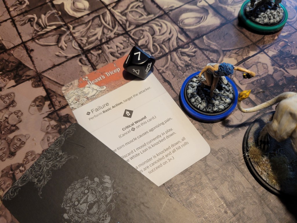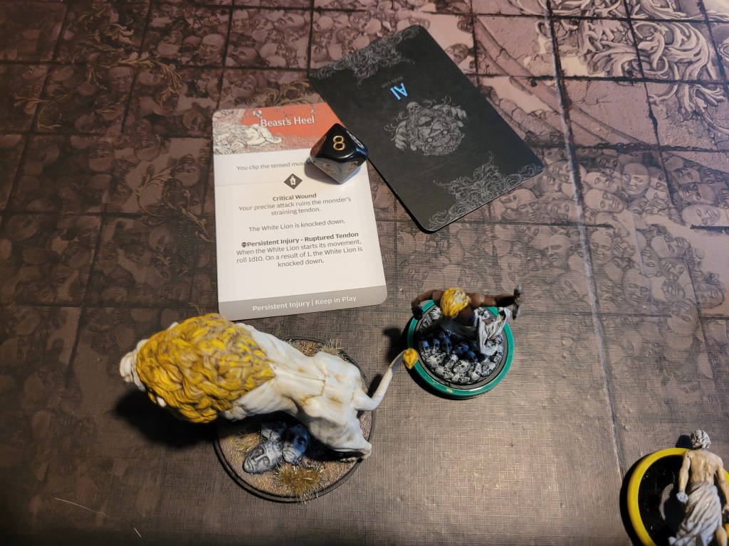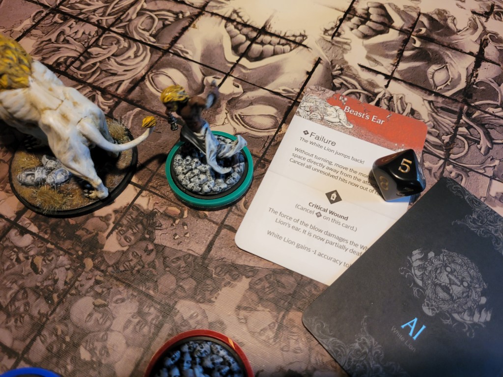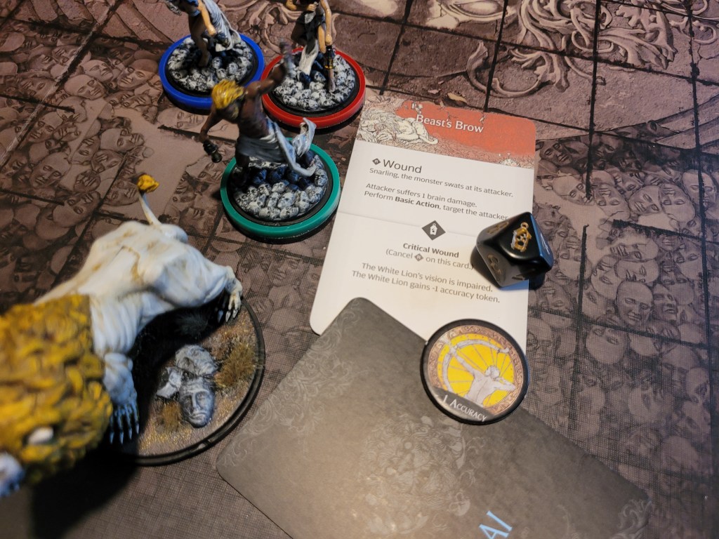 Finally, as the lion hadn’t gotten too far away, Lionar attacked again, but he flinched at the sight of the impending retaliation as he struck the Beast’s Brow, but as luck would have it – he rolled a crit! -1ACC for the White Lion!
