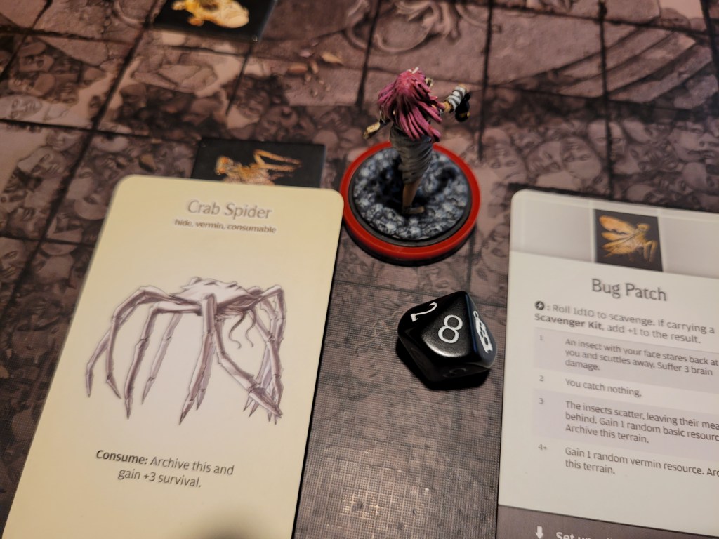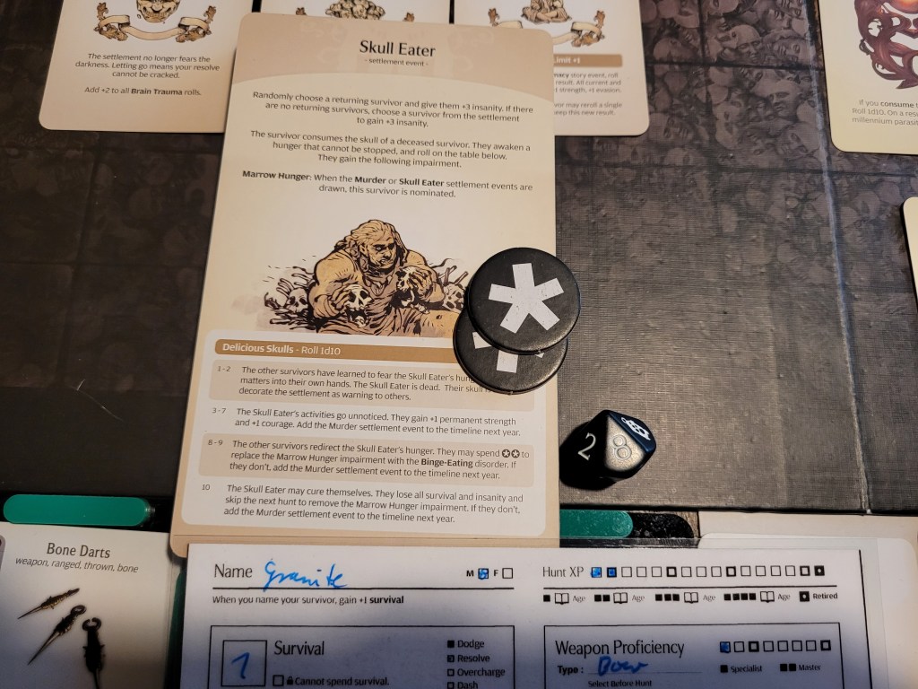 A random survivors discovered a craving for delicious treats.. and it was Granite. He rolled an 8, which offered us to a chance to immediately spend 2 of our 5 endeavors to turn his bone-crunching munchies into Binge-Eating (D). Or, well, we could not do that and get Murder (SE) next year.
