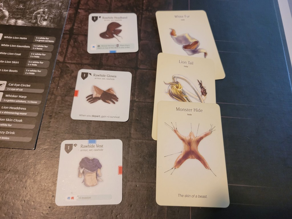 Almost forced to head out again already, I looked at what new gear I wanted to make. From the resources we had left I built a rawhide core (headband, gloves and chest) and I decided to sit on the rest, waiting to see what we’d get from this hunt.