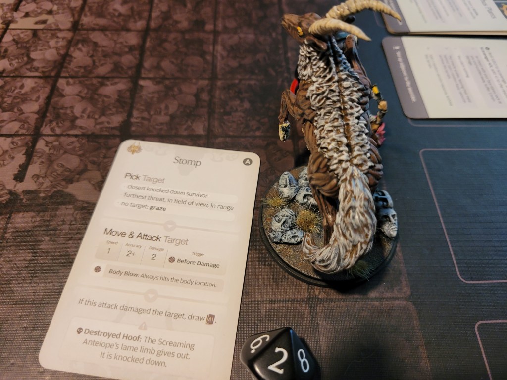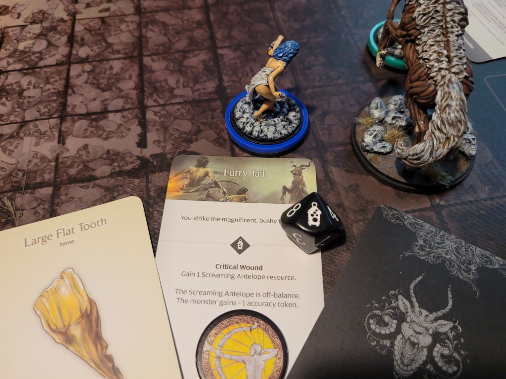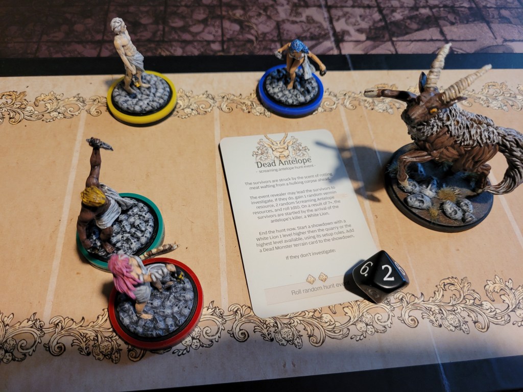 And more ominous encounters followed – a little further along Alissa spotted a Dead Antelope. I was a little hesitant to roll this, though I usually feel very confident about this card. Alissa still had her reroll.., so I ultimately went for it. A 2 – we were safe!