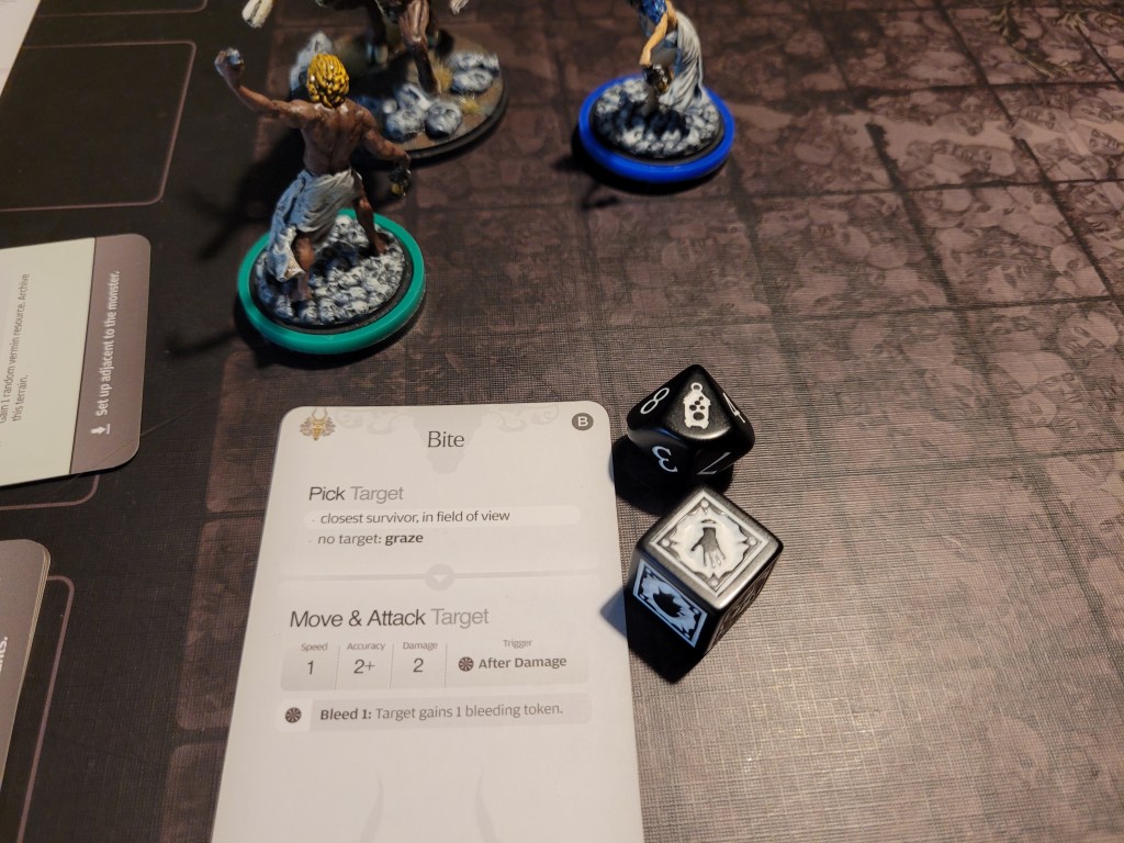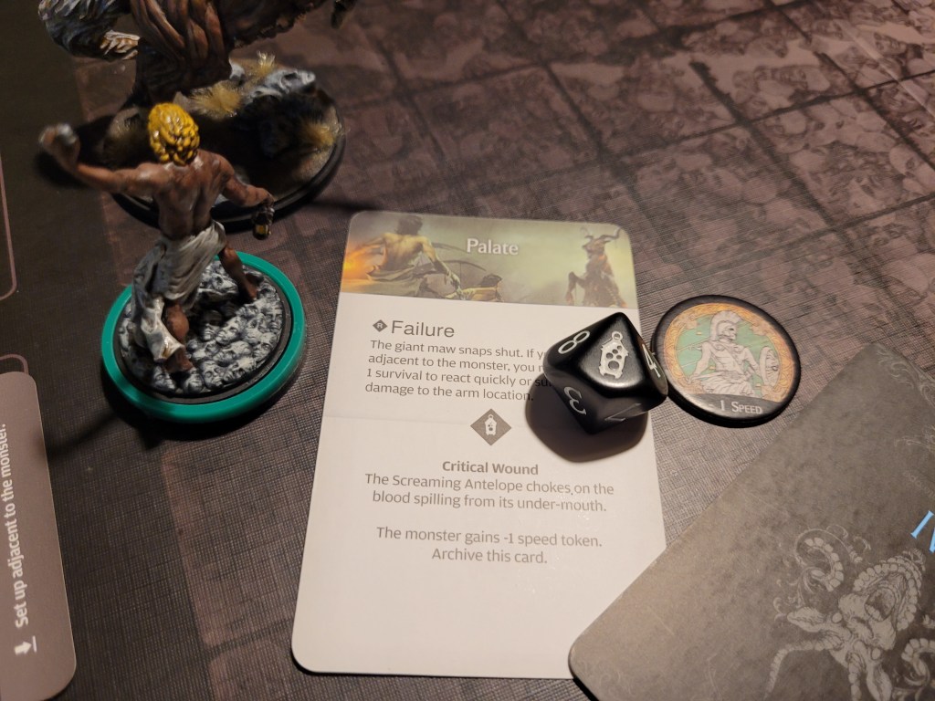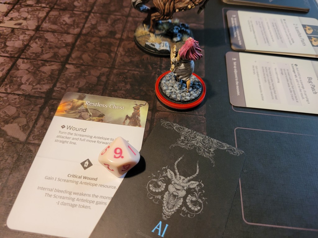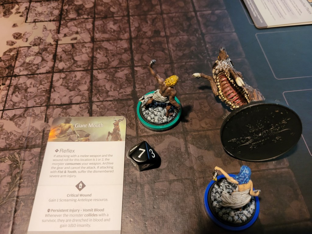 Alissa moved up to put the hurt on the monster! She hit twice and without delay, she drew the trap! Yup. That’s a brain trauma! And she rolled an 8.. +2 .. that’s Frenzy!