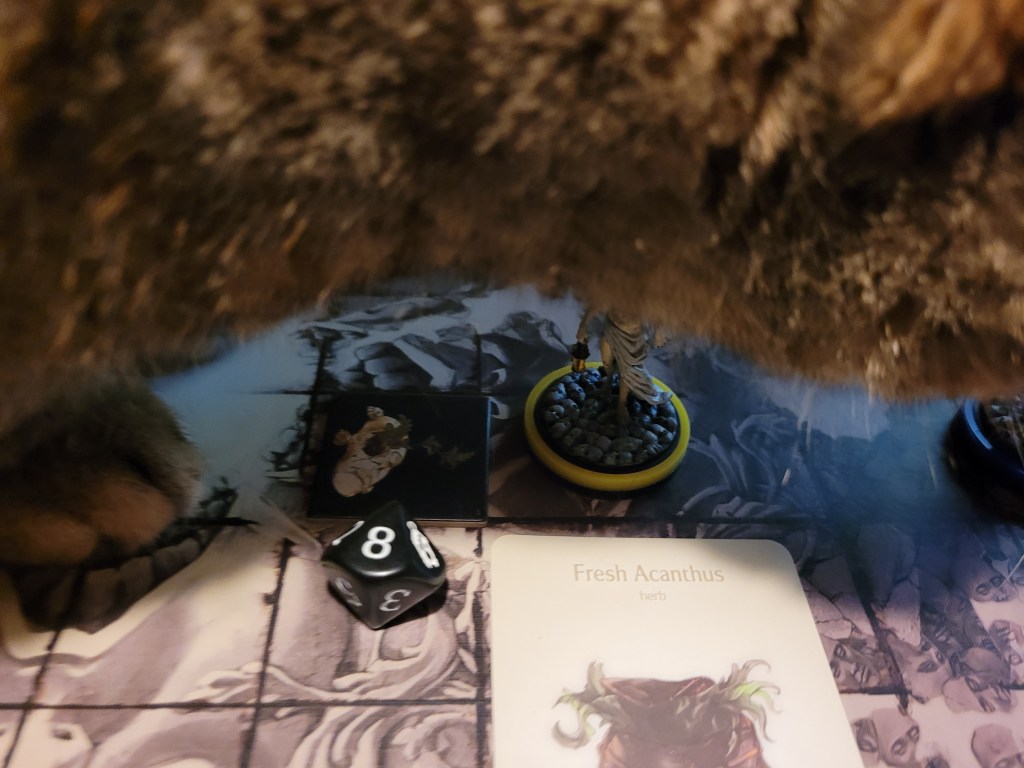 As the Feline Entity kept a close watch over the proceedings, Calys made her away towards the Vermin Patch but did not reach it, whilst Reef got another Fresh Acanthus to go. Alissa wounded one more time, reducing the monster deck to only Bite! She did crit the monster taking a Large Flat Tooth as a trophy! Lionar missed and did not move so he could take on the next attack.