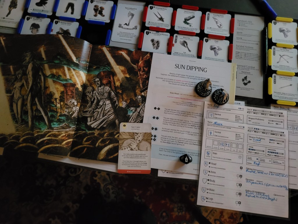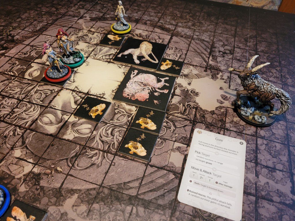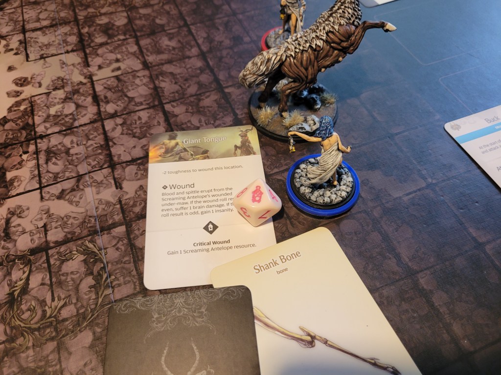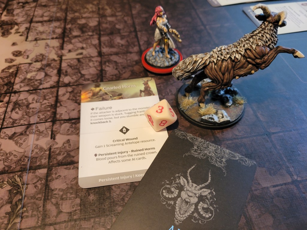 Calys got up yet again and spent 1 survival to move along the antelope’s path. Felis began the turn and this time she at managed to hit the trap – finally! The sound of teeth grinding on stone was nearly unbearable as the monster took off.