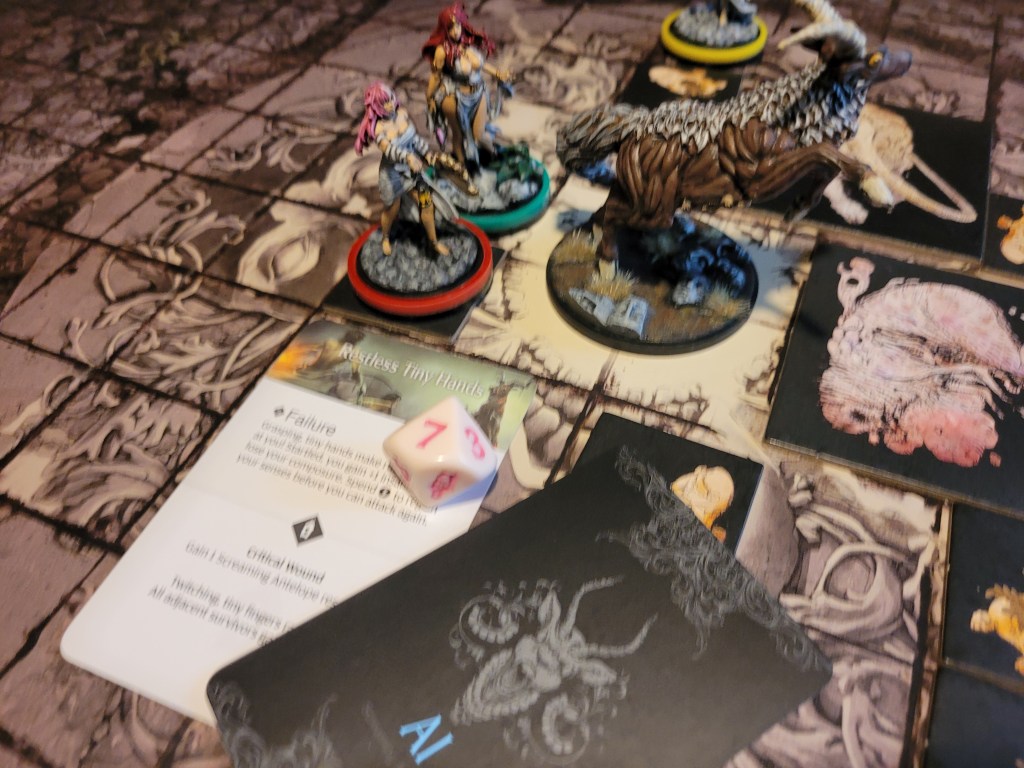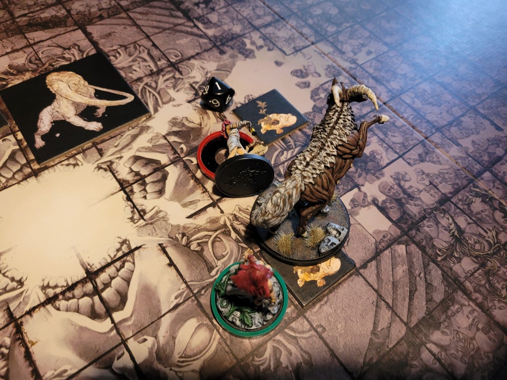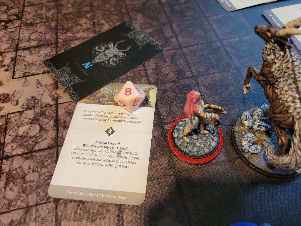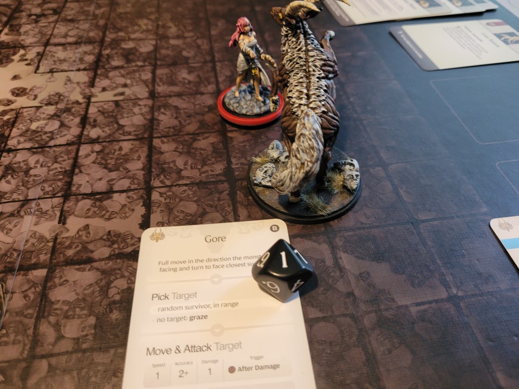 Felis also failed to hit the monster in the rump. Alissa couldn’t get to the monster and instead spent her activation to check its next AI. Great Kick or Chow Down number 2… err. That would have to be Great Kick.