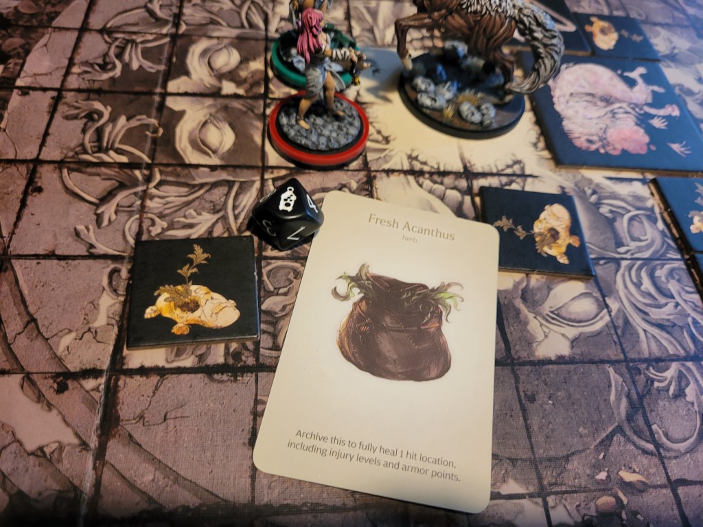 Annoyed Calys picked one more acanthus from under the monster, getting bit and falling over again. (Because I used the wrong colored dice! Aaaah!!)