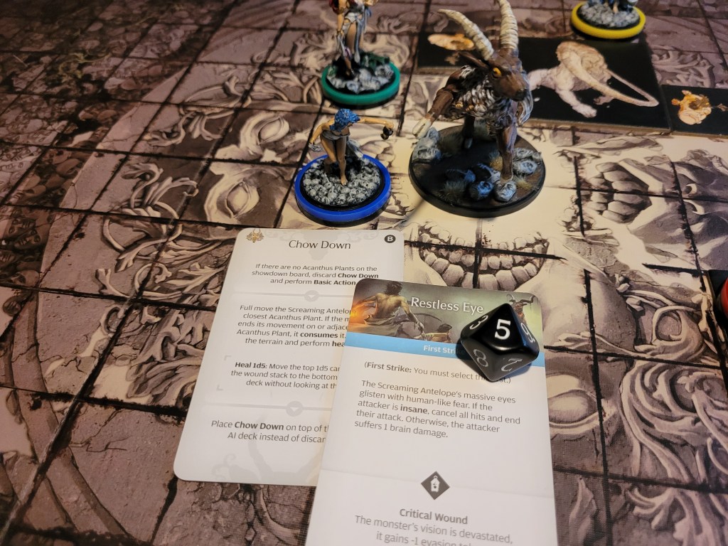 5 cards left, the monster drew Chow Down. One of the cards I did not want to see! It chomped down on the Acanthus right next to Alissa and healed 4(!) wounds. Oof!