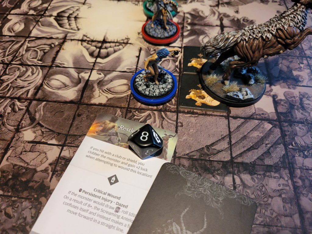 Calys did not really want to head to the blindspot in fear of getting kicked but went anyhow. She’d be hitting the monster on 4+ thanks to the lantern and .. finally changed things around! 2 hits!