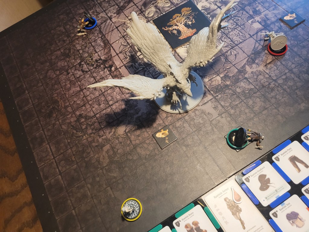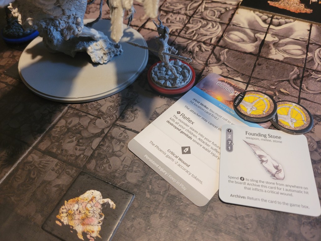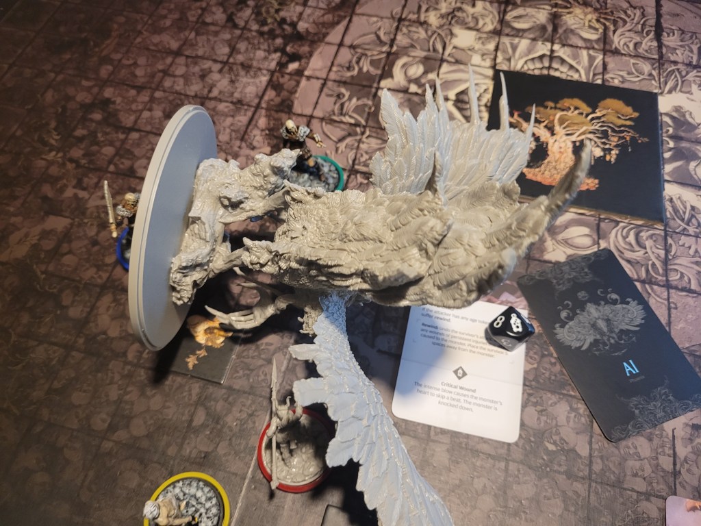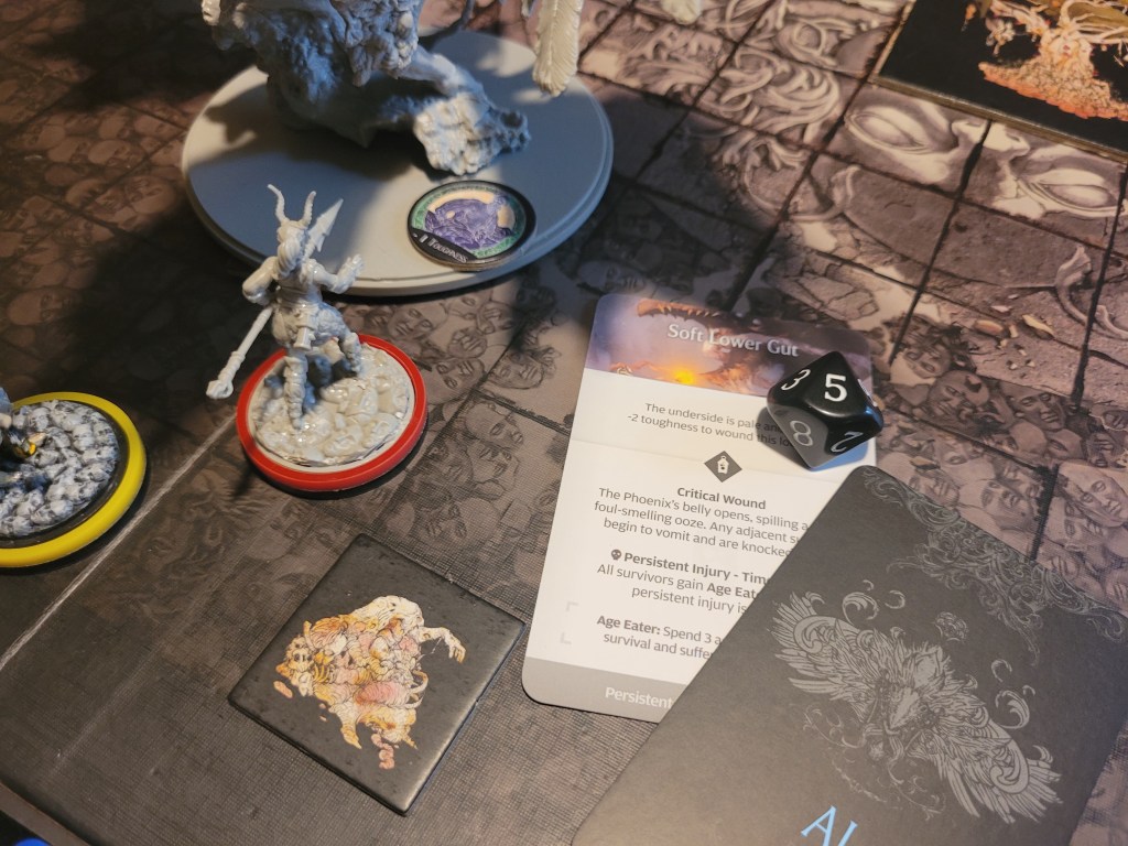 Whilst on par for lethality with other Node 3 Quarry Monsters, no monster can dish out quite as much random bullshit as the Phoenix. Including, but not limited to: resetting your campaign, forcing survivors into retirement due to rapid aging or – if my math isn’t too far off – a 1 in about 3300 chance of deleting your entire hunting party on the first card draw at Lvl1.