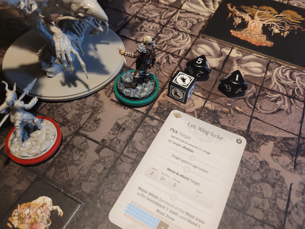 4(5) cards remaining. Left Wing Strike! The last threat to wound was Sol. And the monster missed twice on 6+. Same with the basic from Zeal. The stone to its eyes had immediately started paying off!