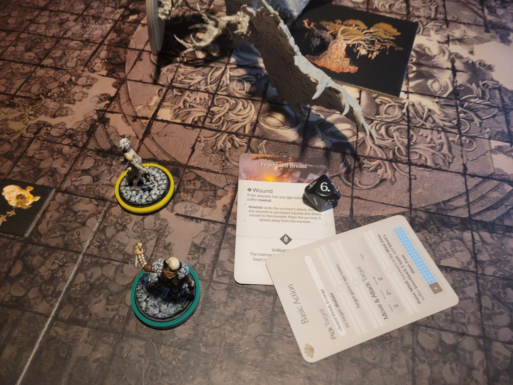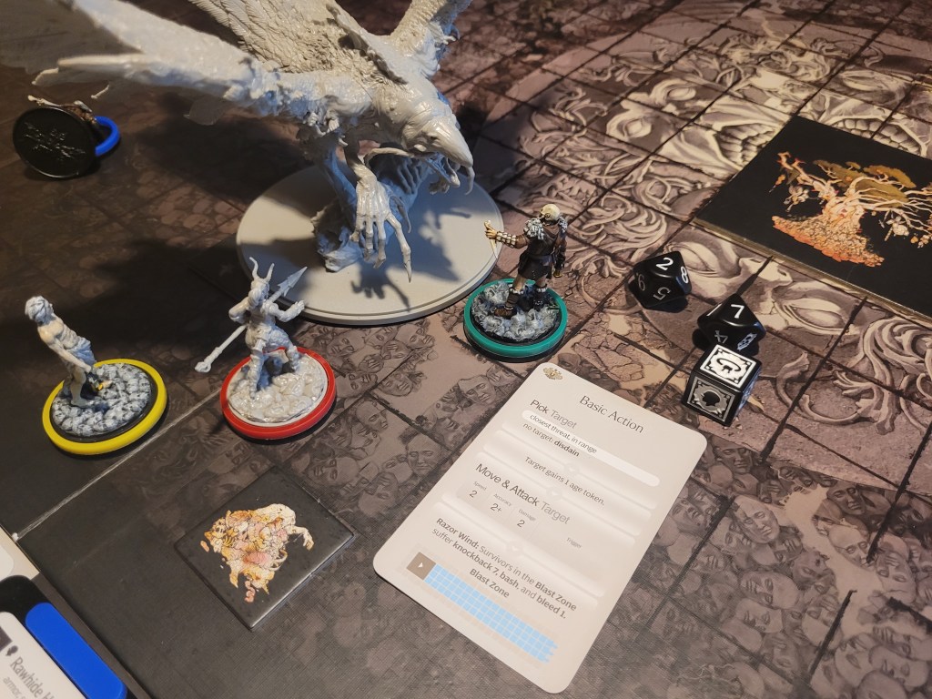 2(3) cards remaining. Wing Punch. The random survivor was Sol once again. The monster missed him on 6+ again. But he did get caught up in basic afterwards, just having to take the Blast Zone effects now – Knockback 7 and a bleed.