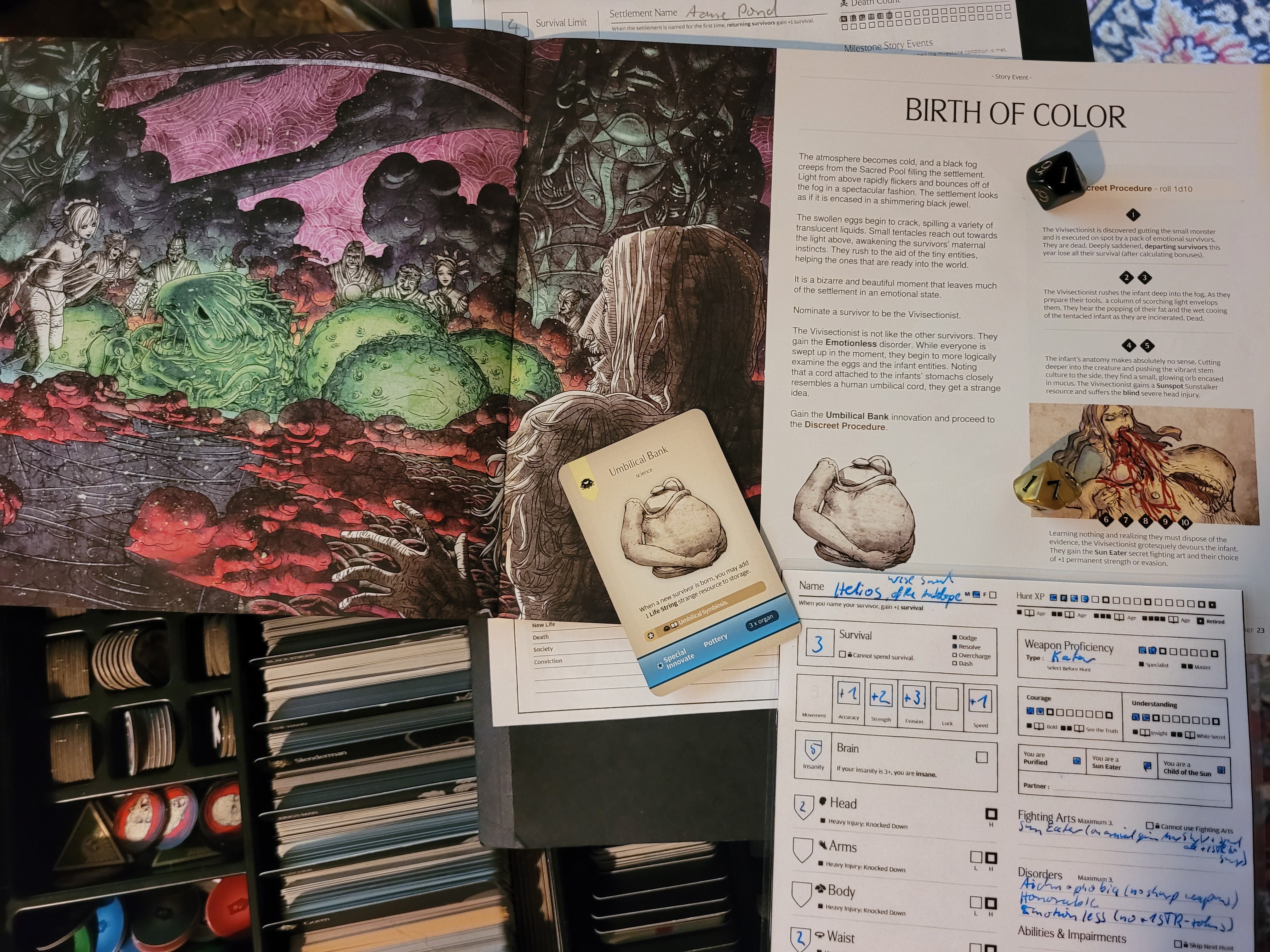 The small Sunstalkers have begun hatching! We are all moms now! Well.., all except for one person – and I nominated Helios to be the Vivisectionist. This had him gain Emotionless (D) – which did feel appropriate – and he immediately started having ideas on how to improve the settlement. We gained Umbilical Bank (I) from these efforts as Helios started to wonder how the newborn monsters might look from the inside.
