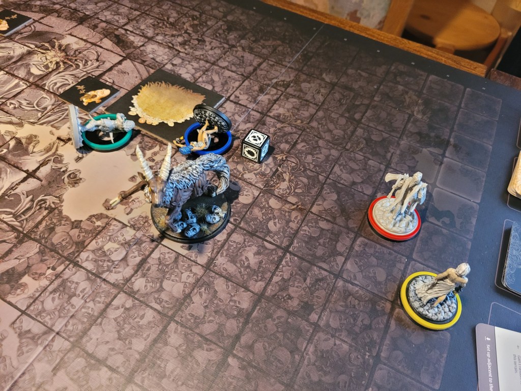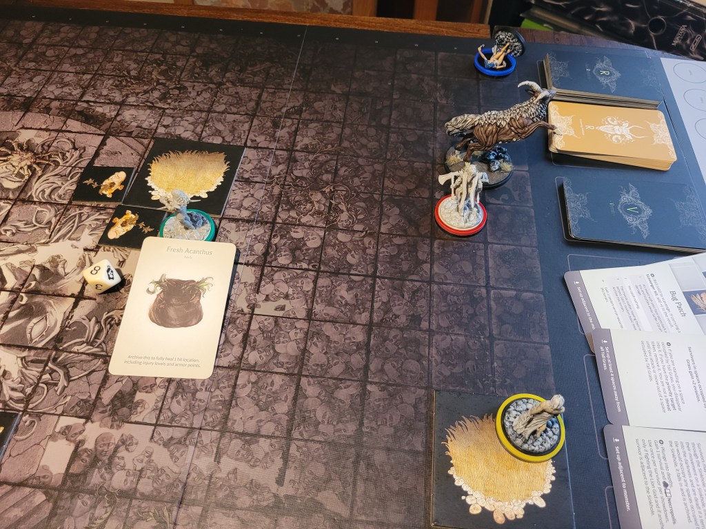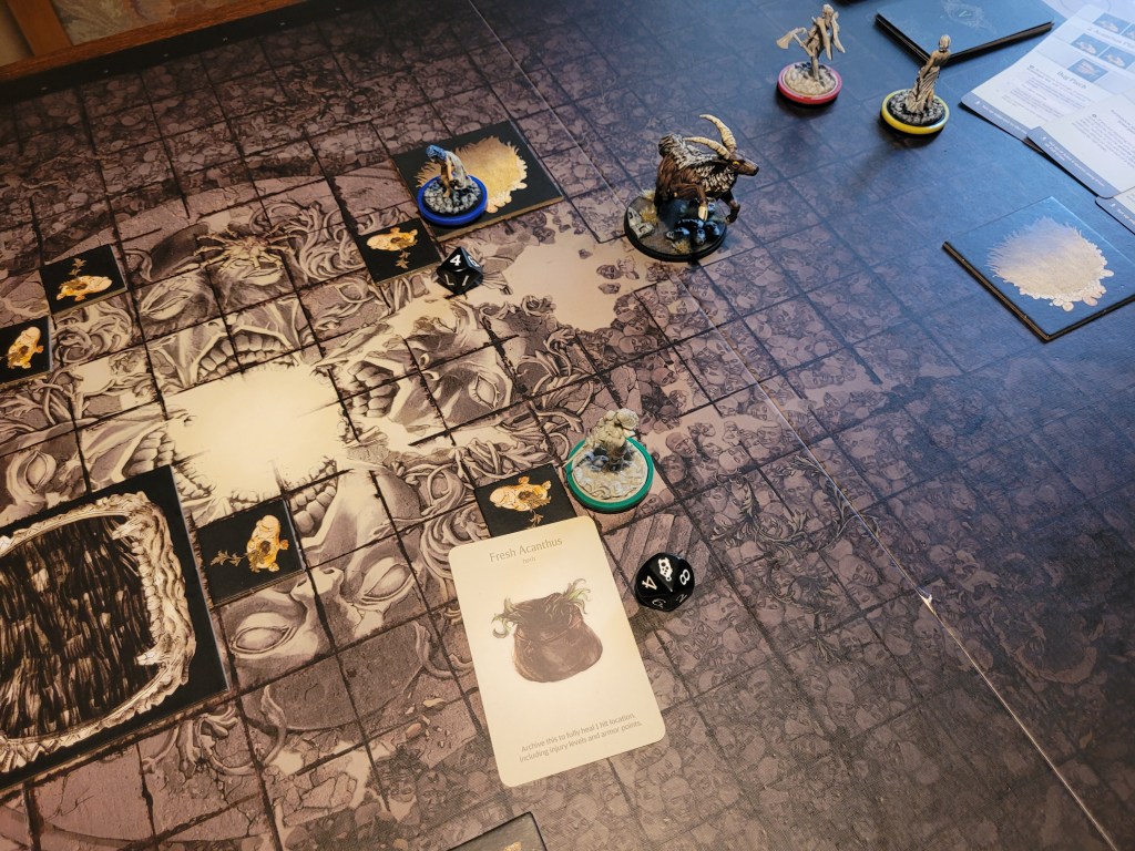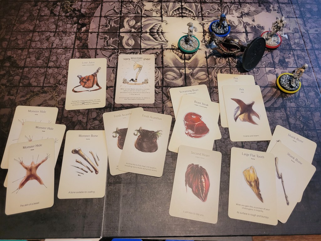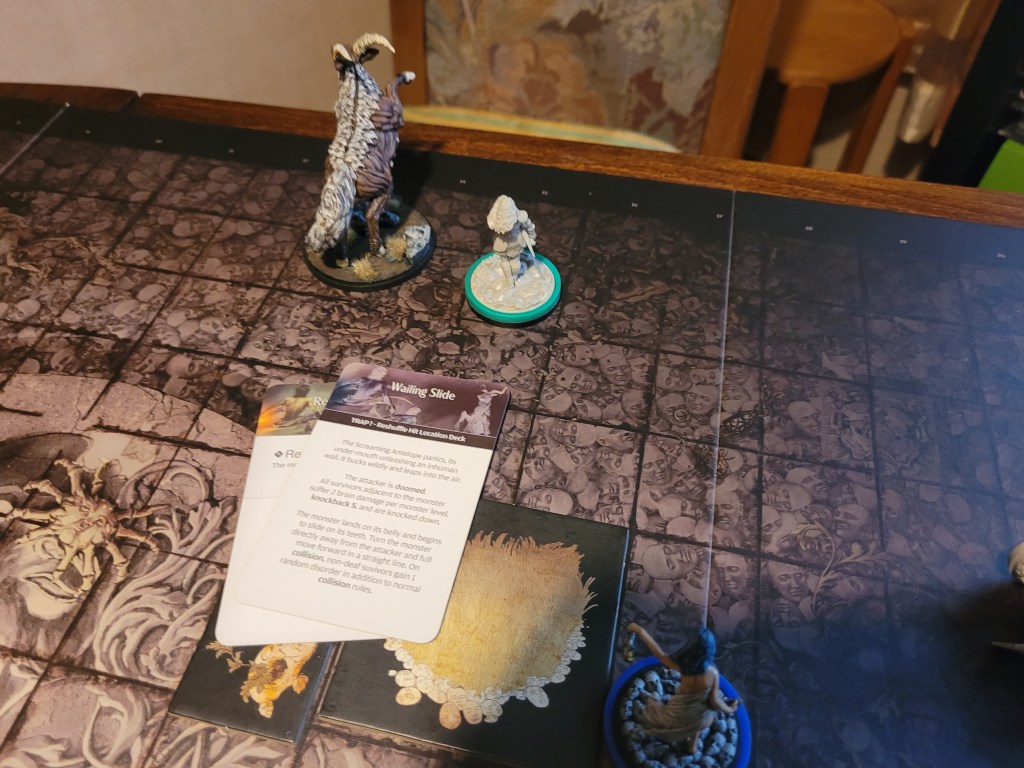 To nobody’s surprise the next thing we found was a Sickening Mess (basic HE94).Alissa, Reef and Calys all started chowing down, taking a -1STR-token, whilst only the young Moon (+1STR) investigated, also triggering Bold. With deft hands she was able to secure an unspoiled Monster Hide from the pile of goo!