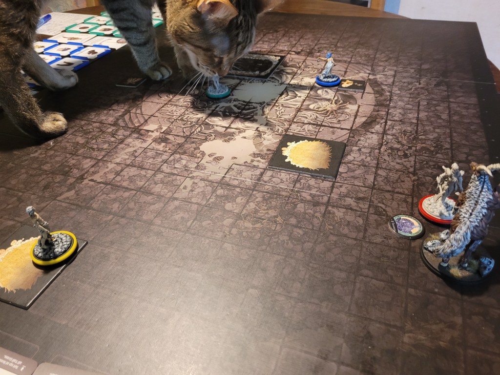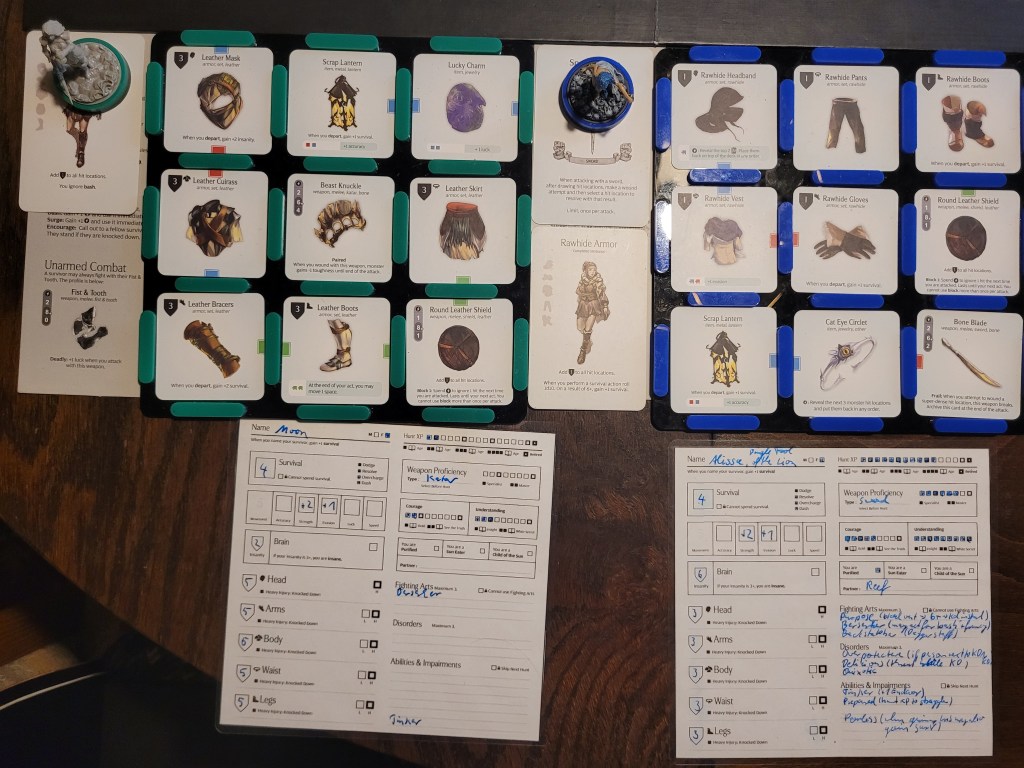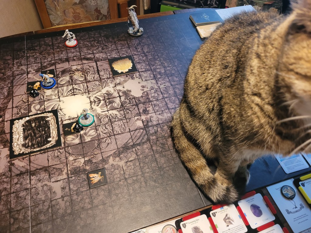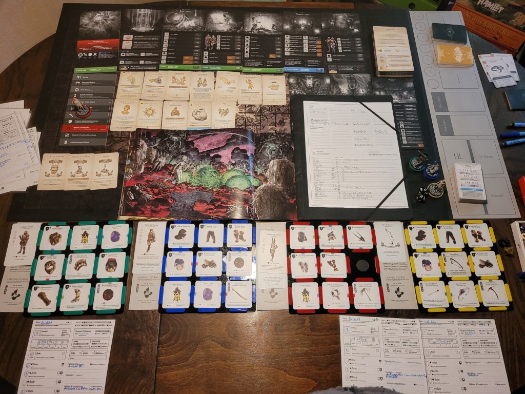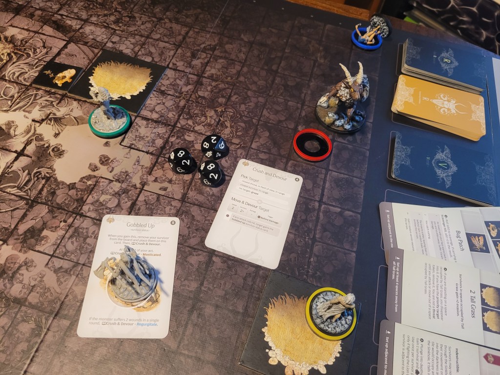 To nobody’s surprise the next thing we found was a Sickening Mess (basic HE94).Alissa, Reef and Calys all started chowing down, taking a -1STR-token, whilst only the young Moon (+1STR) investigated, also triggering Bold. With deft hands she was able to secure an unspoiled Monster Hide from the pile of goo!