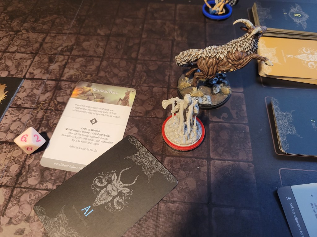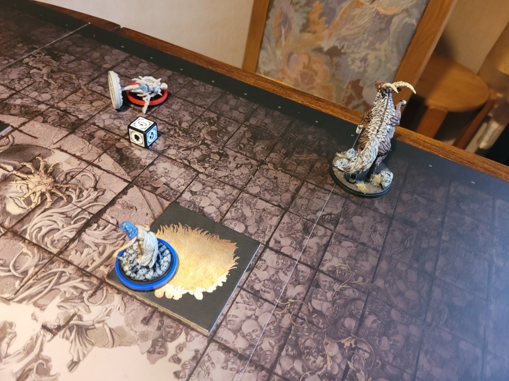 It randomly selected Alissa to go after and hit her hard in the stomach, knocking her down! With Diabolical it stomped on her as well, dealing another hit to her gut! All her armor gone at that spot already, and a light wound dealt, she was flung into the back corner of the board!