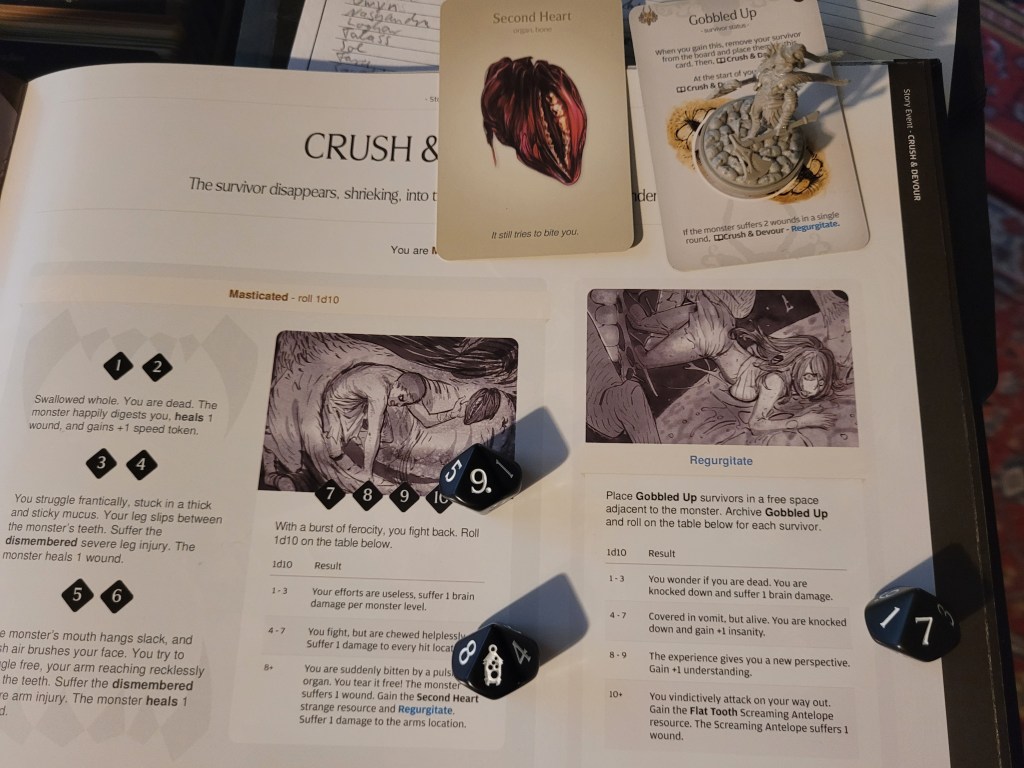 She rolled – a 2 for the Crush and Devour event table! No – that would outright kill her! She still had her reroll though! And she rolled into a 7, instead! Yes! She was fighting back now! And a 10 on the other table! She tore at the monster’s Second heart! An internal wound was dealt and she was going to be spit out! Hitting the floor covered in saliva she gained 1 insanity. What a turn of events!