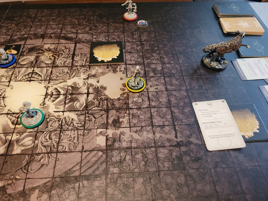 Reef on the other hand moved a little closer to the monster with his dash and activated his bow. He had 4SPD for the attack and he hit all 4 times – 1 of which was perfect. (This is a mistake with little consequence overall, but he should have only had 2SPD) From the remaining hits he was only able to turn 1 more into a wound.