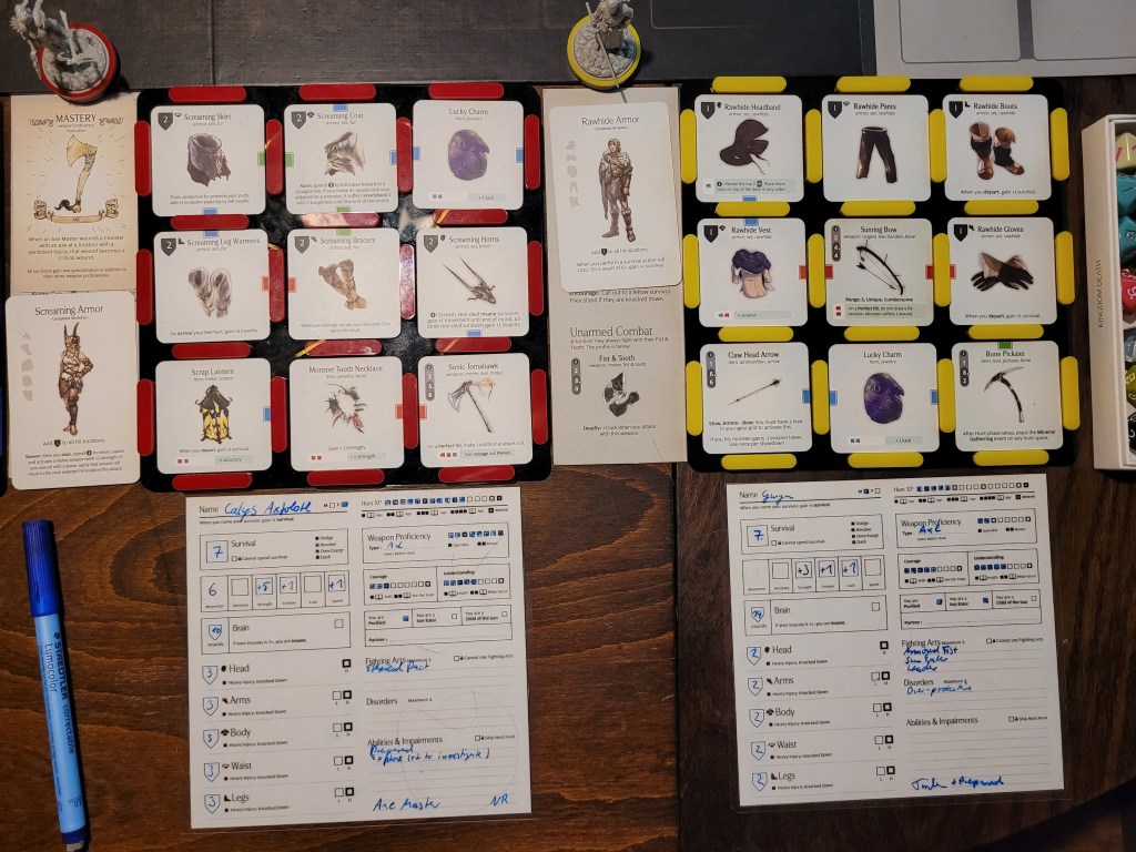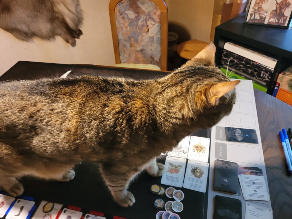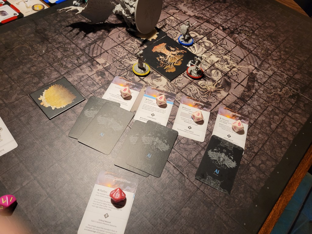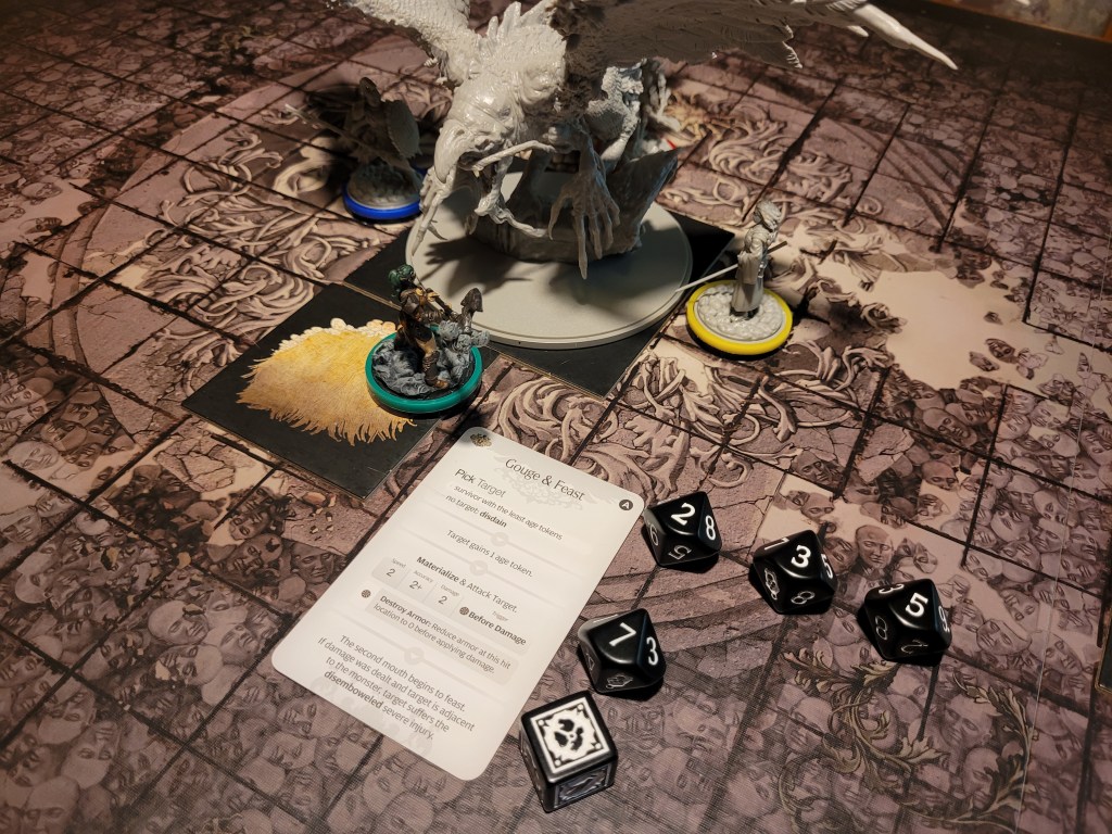 We began our next turn with Moon returning to the front spot directly below the monster’s beak, invoking her Cat Eye Circlet again. The cards that got revealed were not persistent injuries this time, but we could make this work, despite the Age Tokens on everybody besides Calys.