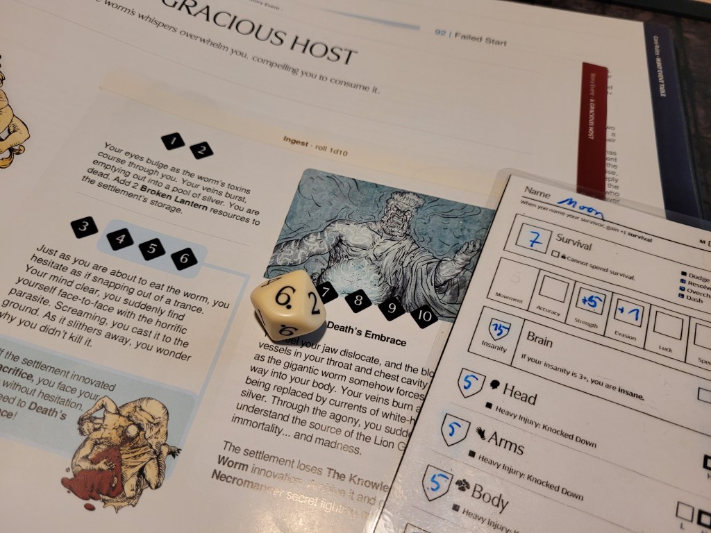It did take a reroll for her to survive the encounter (she had rolled a 2 initially), but in the end she re-awakened, the worm held tightly in her arms.