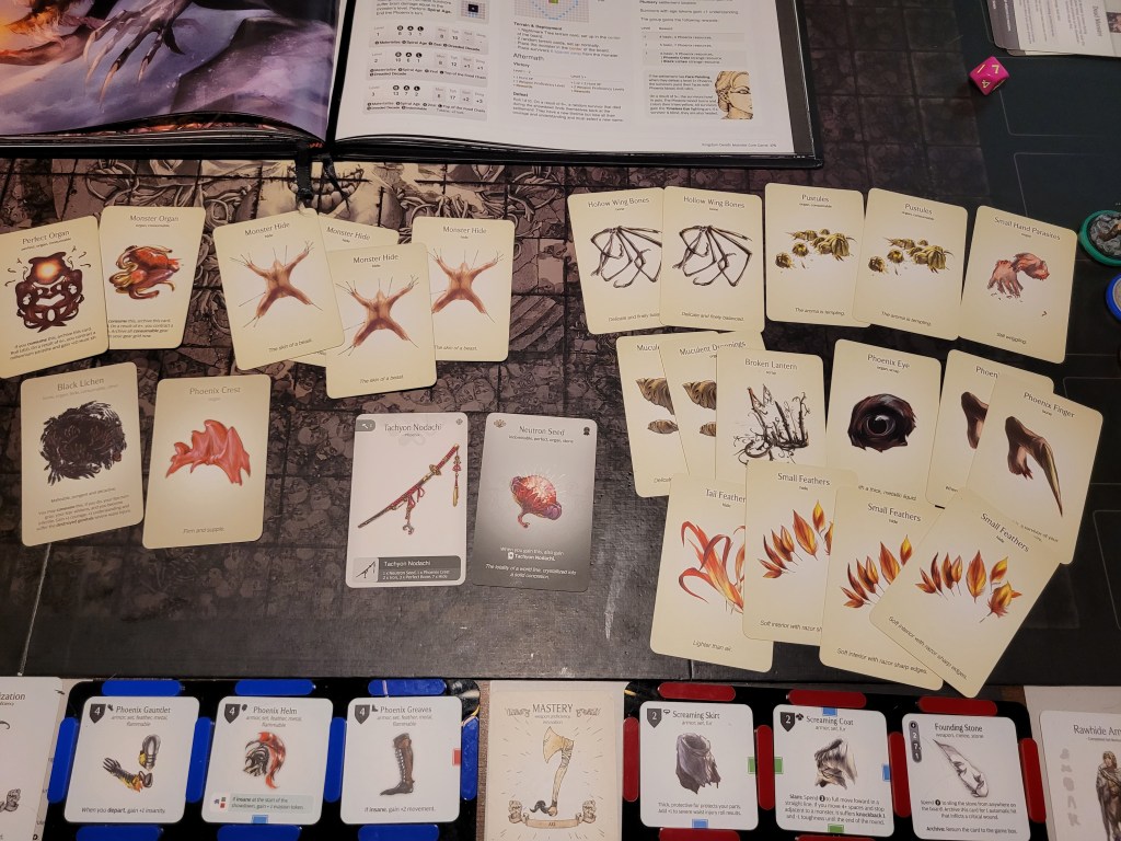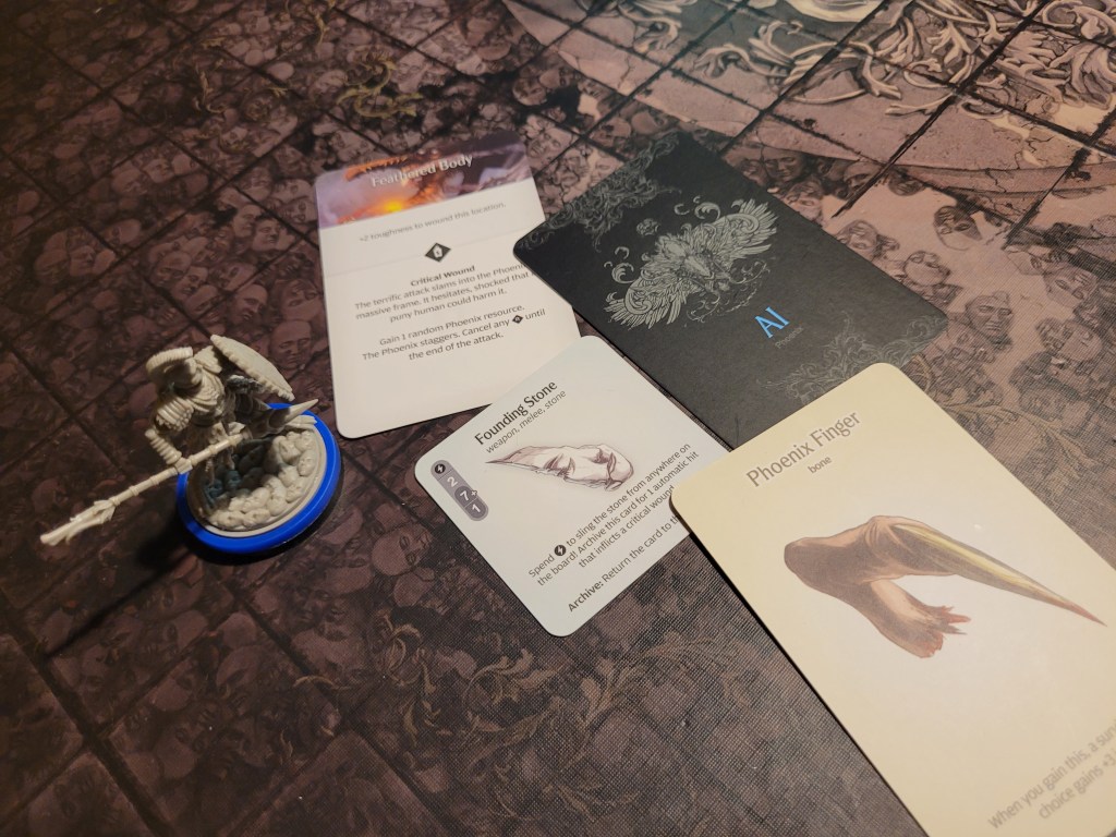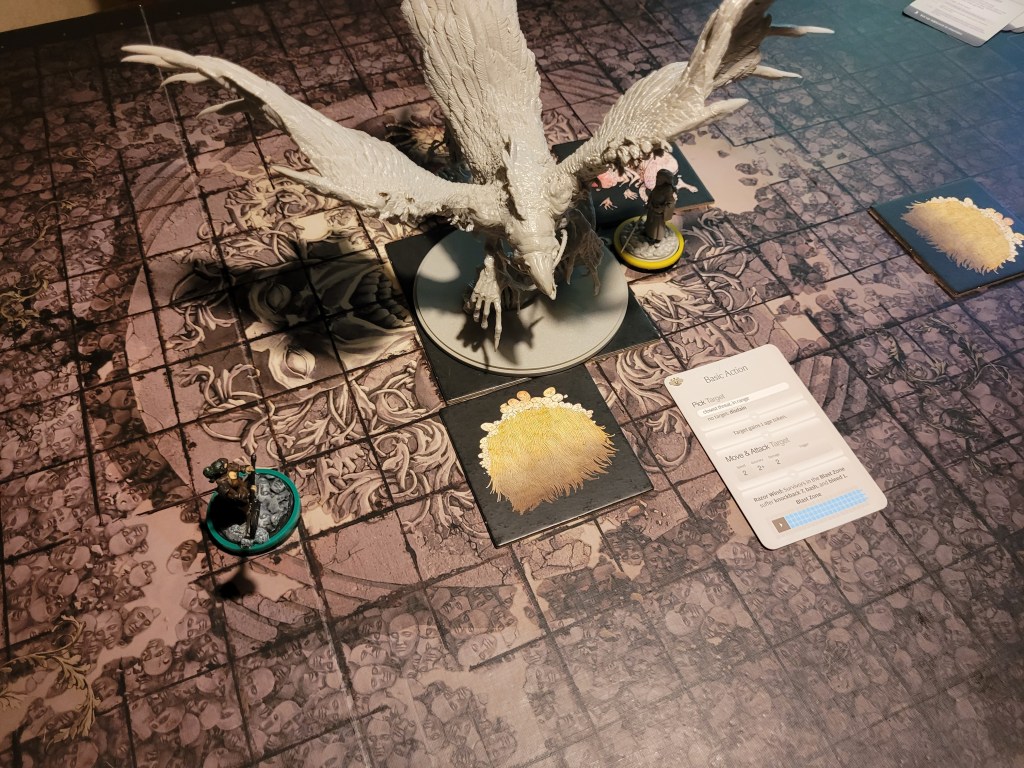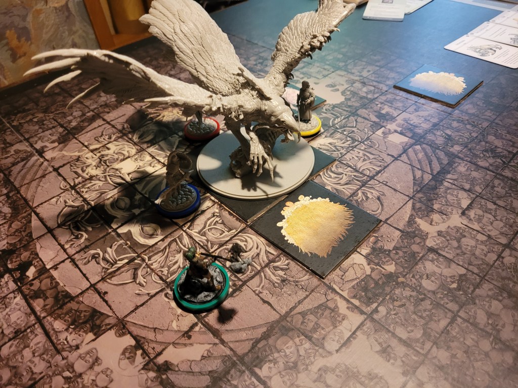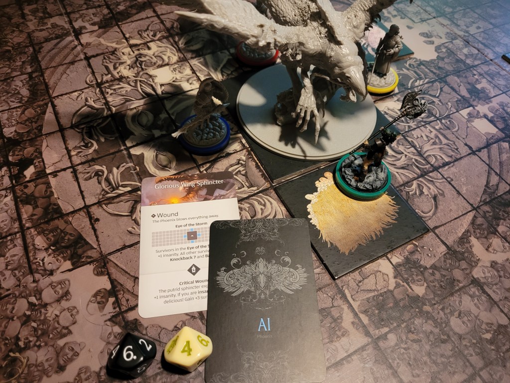 We put the Feathered Wing on top and started the turn’s set of attacks by having Gwyn shoot his Claw Head Arrow at the monster. He hit the Phoenix and got the -1EVA token applied onto it, even as the wound failed.