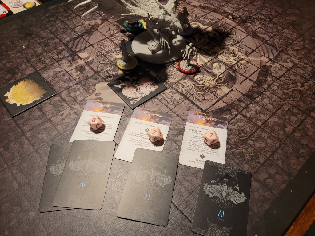 Everyone besides Calys gained an Age Token, and I was steadfast at trying to maintain formation to the best of our ability – so I had them all laugh at the Phoenix. It was an incredibly expensive move, costing 3 survival each, but I wanted to try and end this fight as quickly as possible – if we could anyway. This pushed both Moon and Gwyn real close to See the Truth as well.