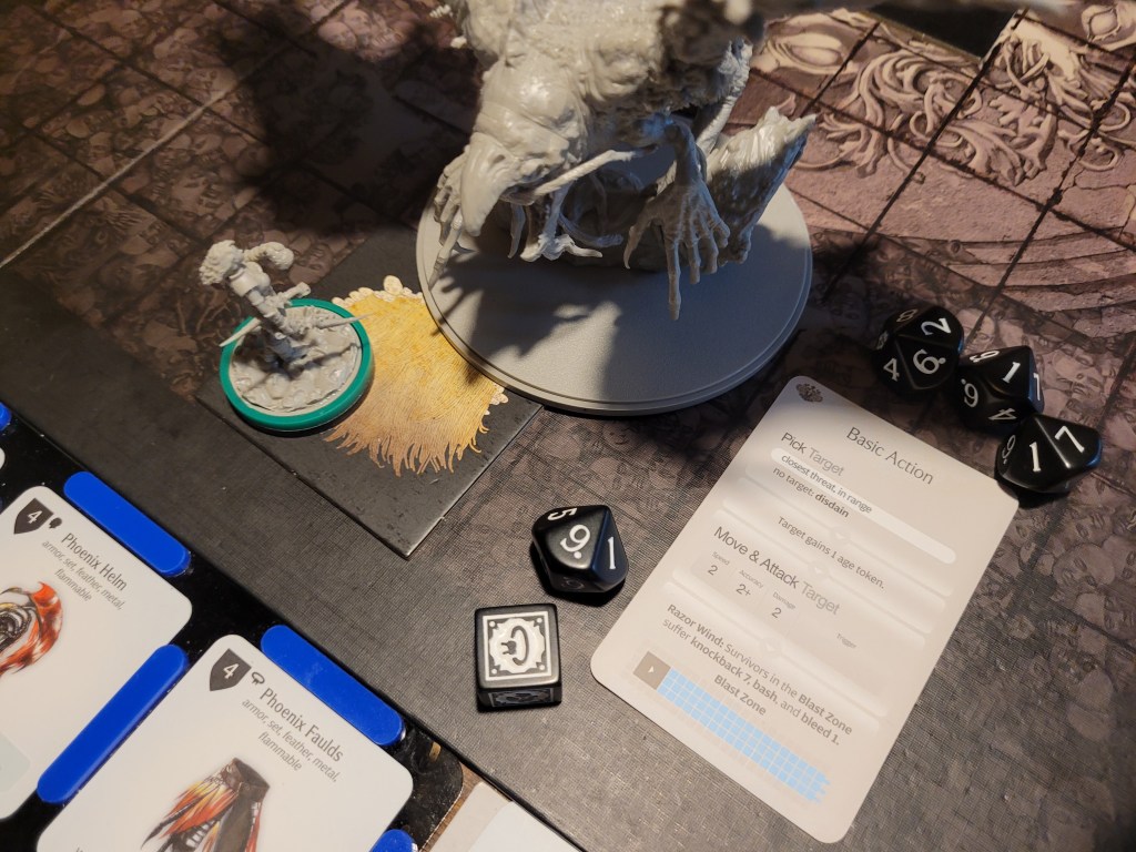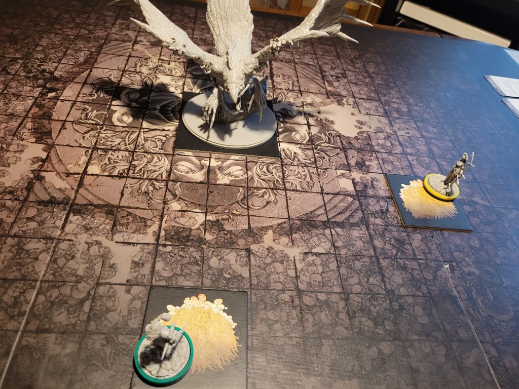 Of course, Gwynevere attacked the monster as well, hitting 4 times, avoiding the trap and any Rewind effects. With Overcharge and Embolden she was able to dish out another 4 wounds on 3 successful attacks before the monster blinked away to the other side of the board. Thanks to having sword mastery at home, she could freely attack and chose what she hit after rolling for the best possible results.