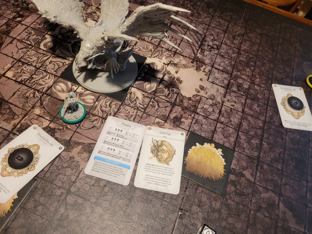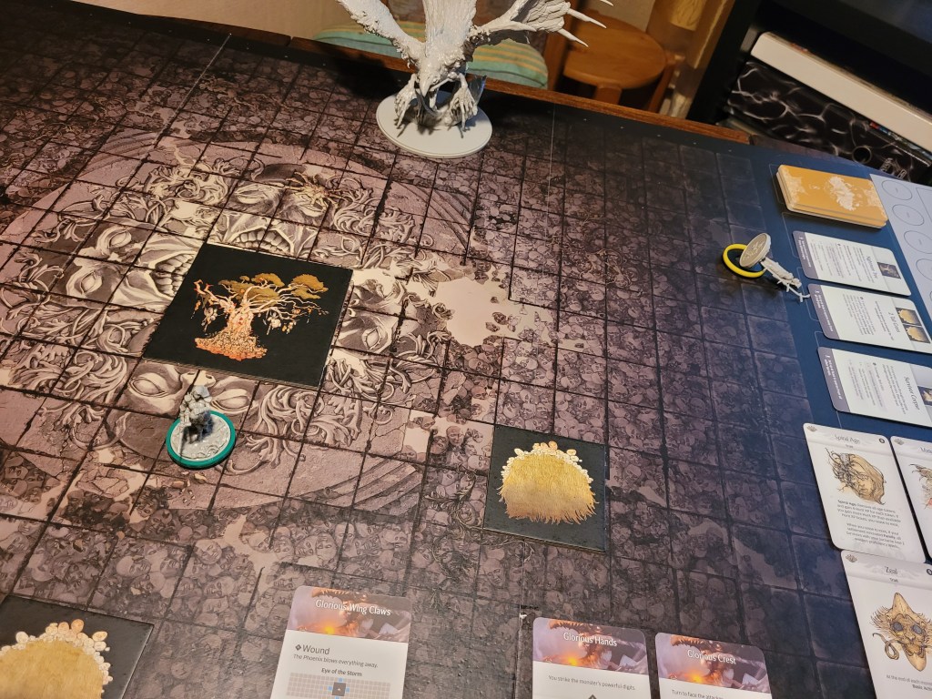 11 cards remaining, Ancient Stare – the monster was too far away from Gwynevere and thus triggered Disdain again. This time Gwynevere aged (+1STR) before the Phoenix ended its turn.