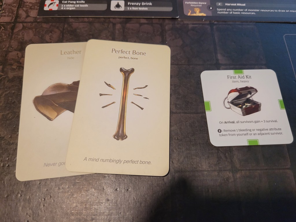 Whilst I did not get even a single extra hide, we were blessed with a Perfect Bone! And with that in hand, we made some Leather and built a Zanba.., I mean First Aid Kit which would replace the Bird Bread.