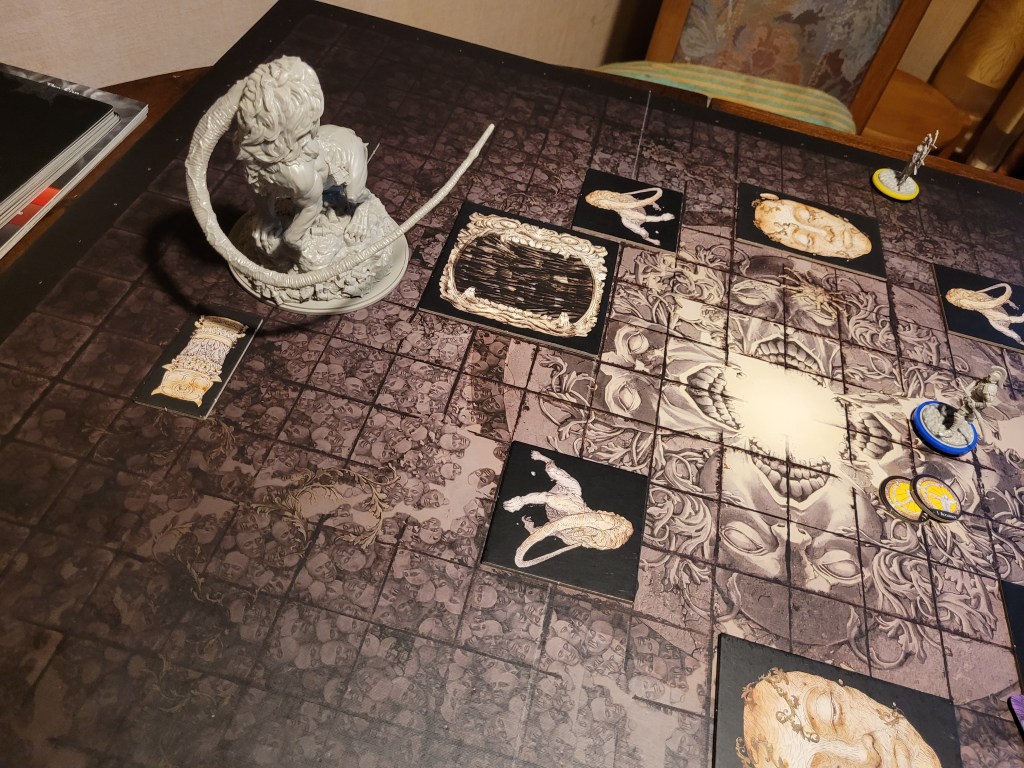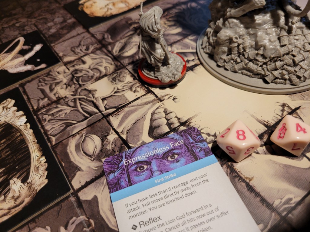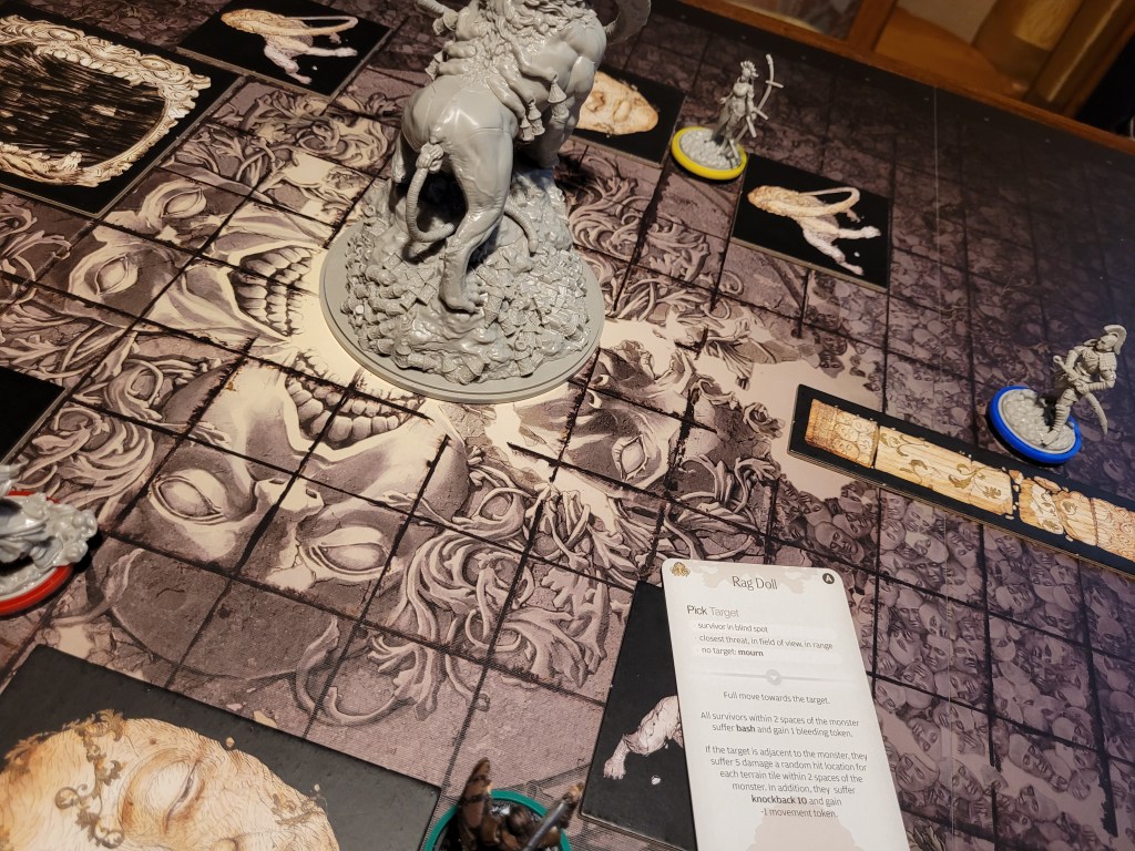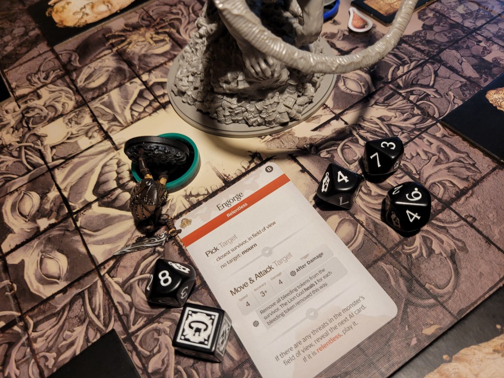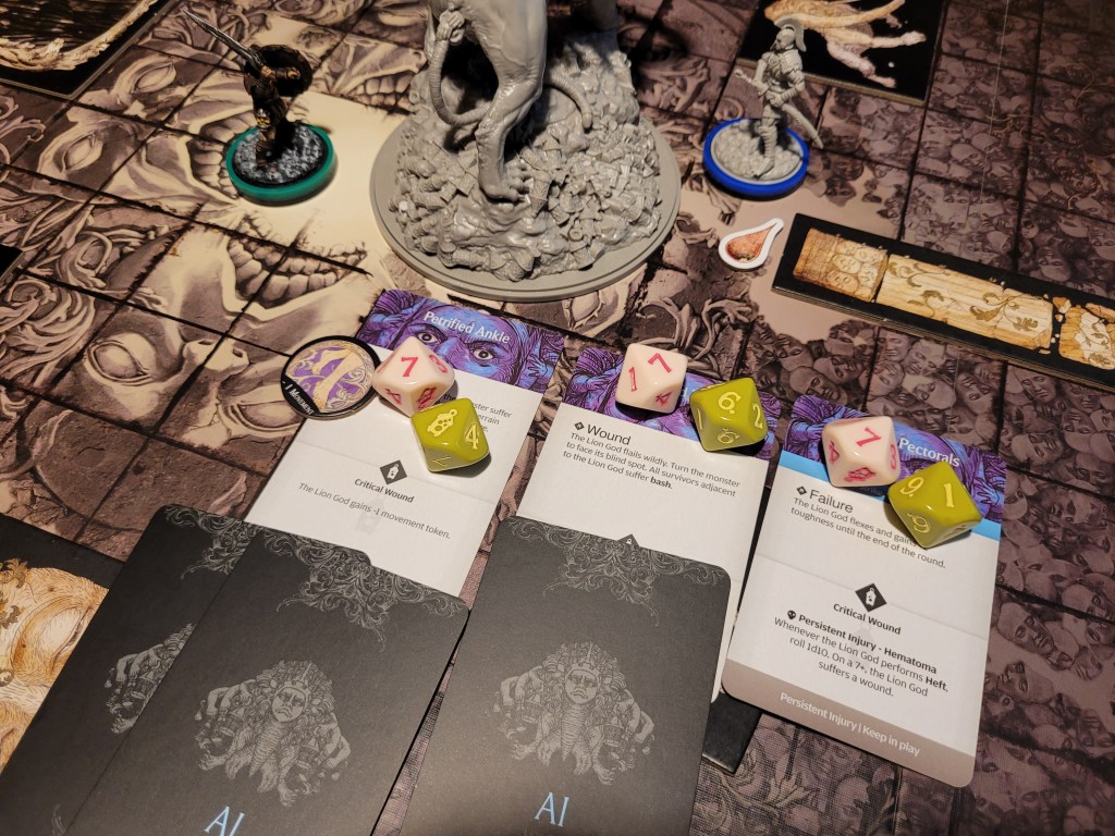With 10 of its initial 15 cards remaining, the smol Lion God attacked us with a Holy Utterance. (Greetings M’lady.) This had the survivors scatter wildly! The monster also revealed the next card of its deck: Crush – which did not have Relentless and thus was not played.