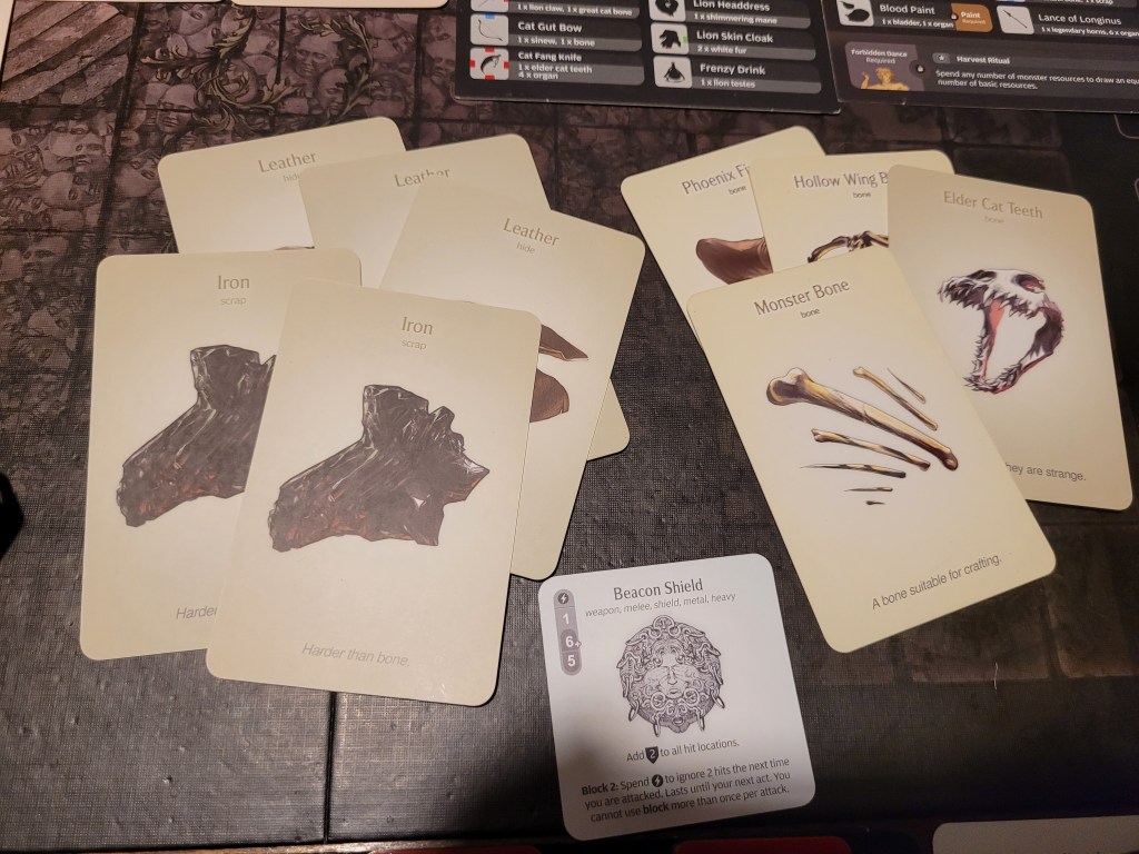 As we started the develop step. we began the phase by using Scrap Smelting (I) to make another Iron, then we converted 3 Leather from the freshly looted hide and piled up 4 bones from storage to finish another Beacon Shield.