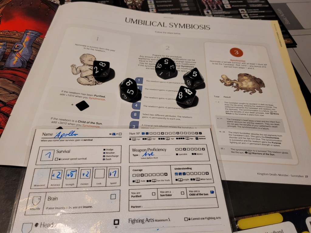 I invested into +1STR/ACC, and with Fara chosen as the caretaker for this child as well, we set to roll the dice under the watchful gaze of the Feline Entity – the Umbilical Symbiosis was successful!