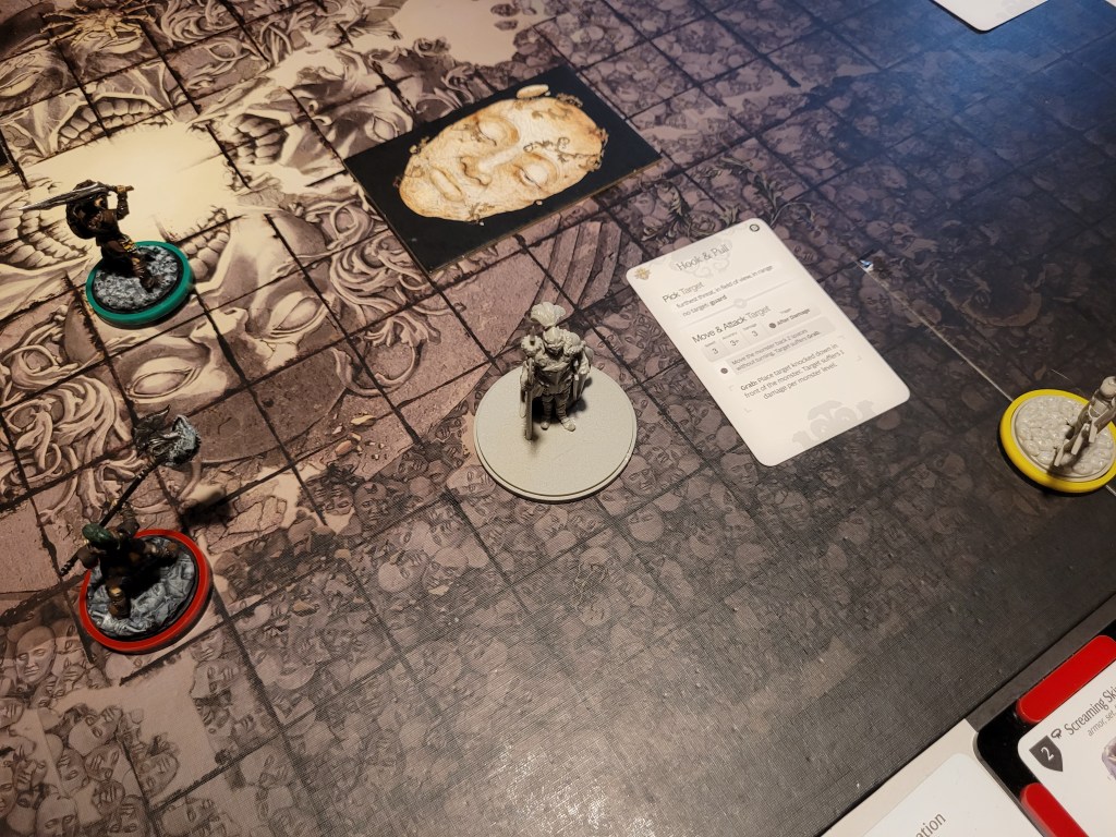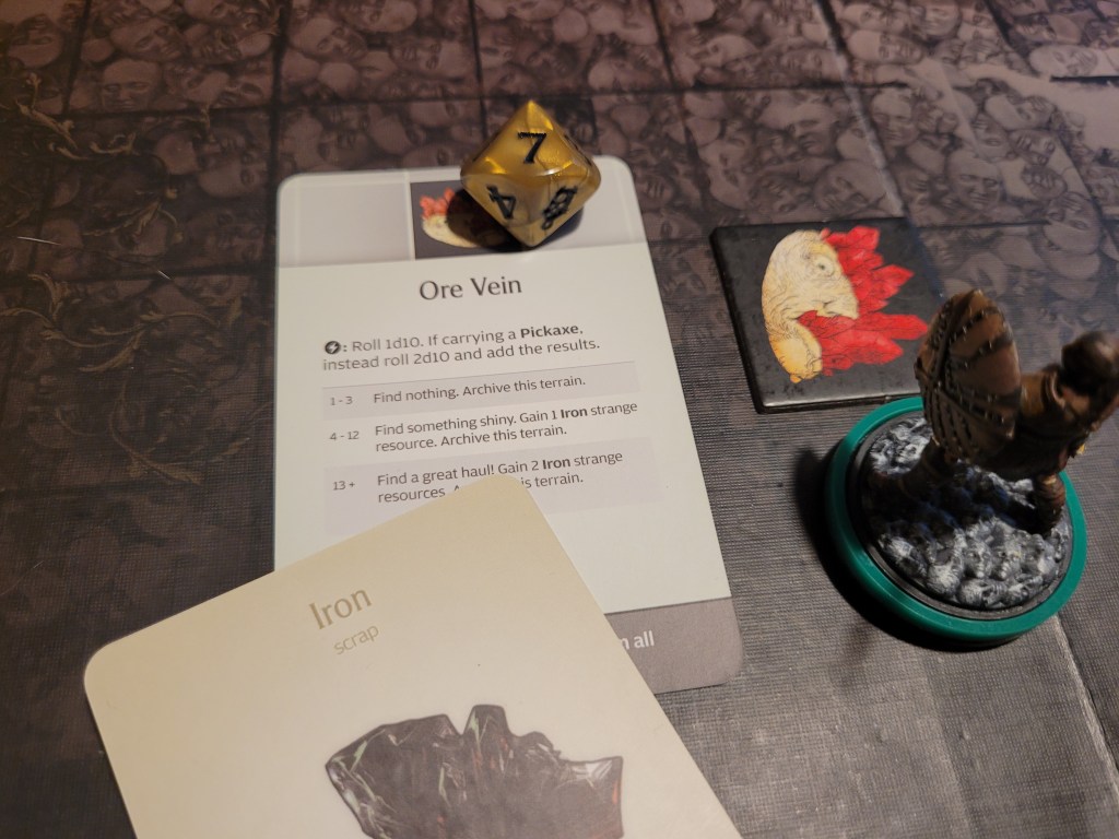 Helios spent his first turn by activating the Ore Vein right next to him (gaining him 1 Iron) before he moved up closer to the monster, getting ready to soak up some aggression.