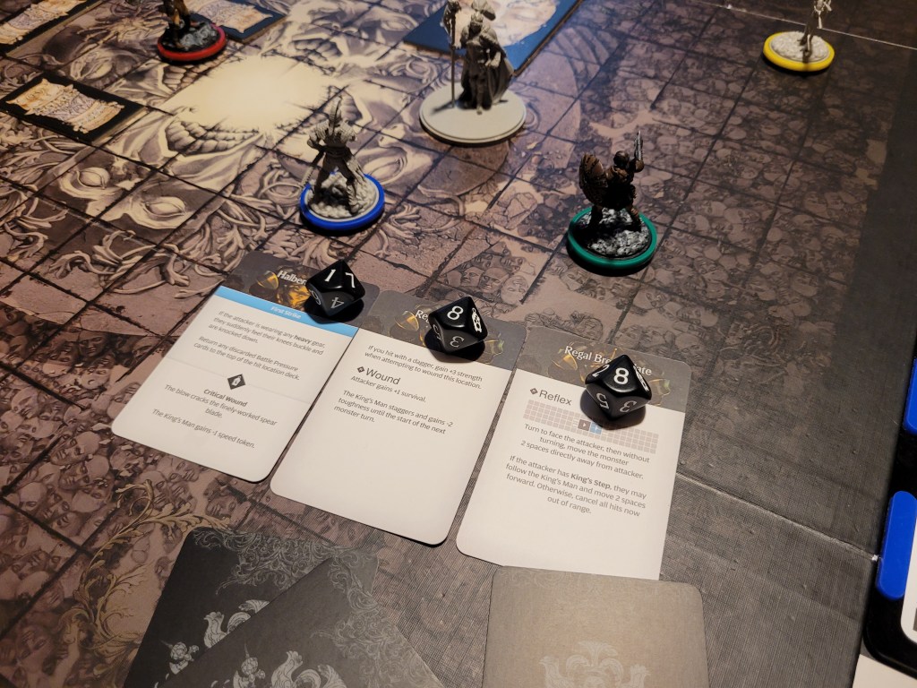 Muzashi boldly sliced the monster from the front after using both Embolden and Overcharge. 4 hits, and with none of us allowed to wear heavy armor, we were able to avoid the knockdown on some of the King’s Man’s most annoying hit location effects. With Battle Pressure returning to the top of the deck, Muzashi dealt 3 wounds, missing the first crit-able hit amidst all of that.