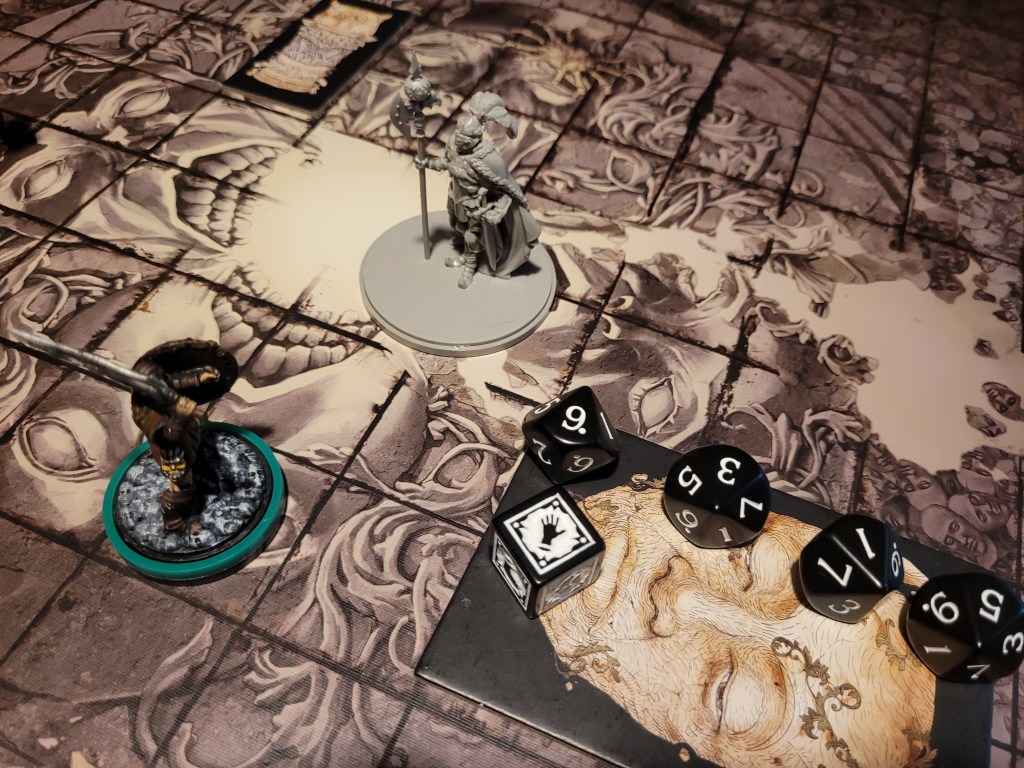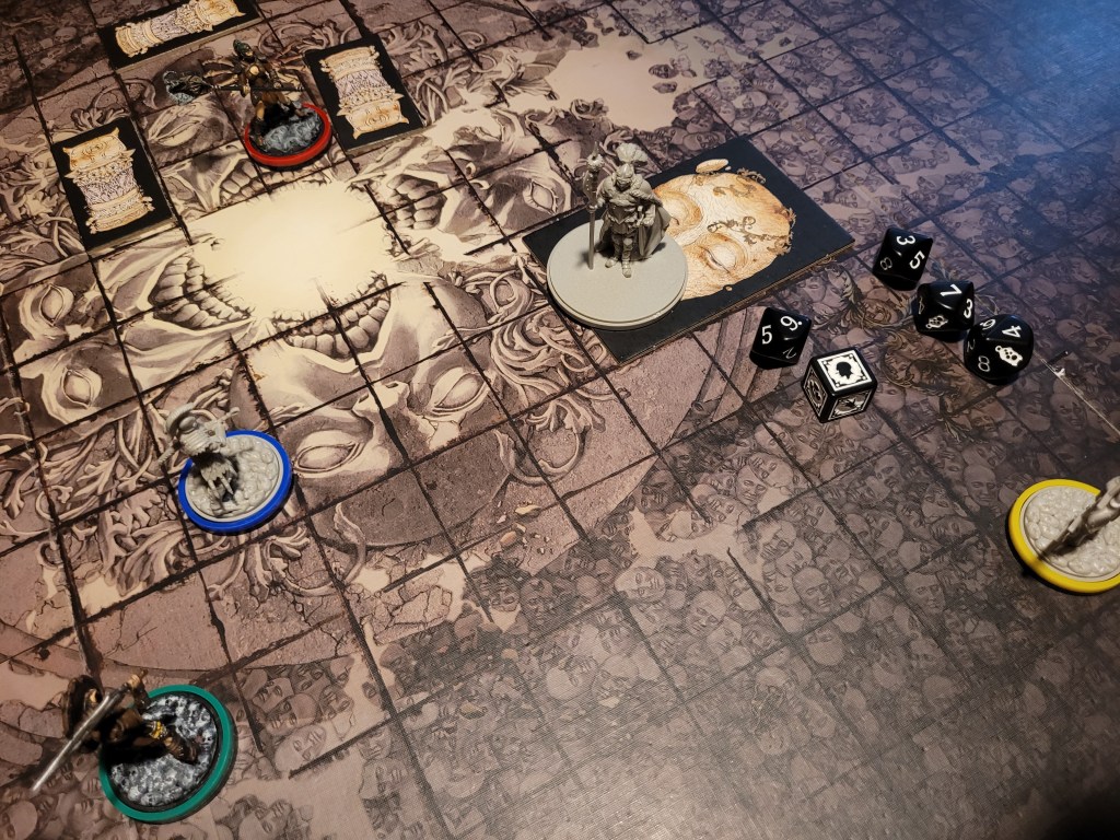 Helios didn’t care. He was exactly 4 spaces away (which he did still reach) and he attacked the monster. Hitting 4 times, he found a single wound, but not without being hit back.